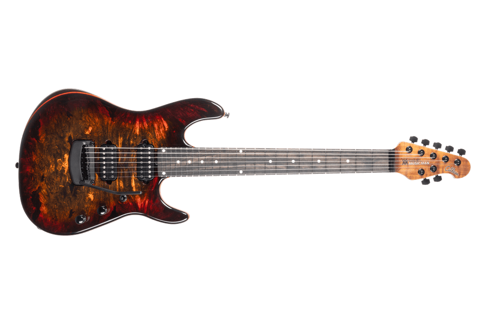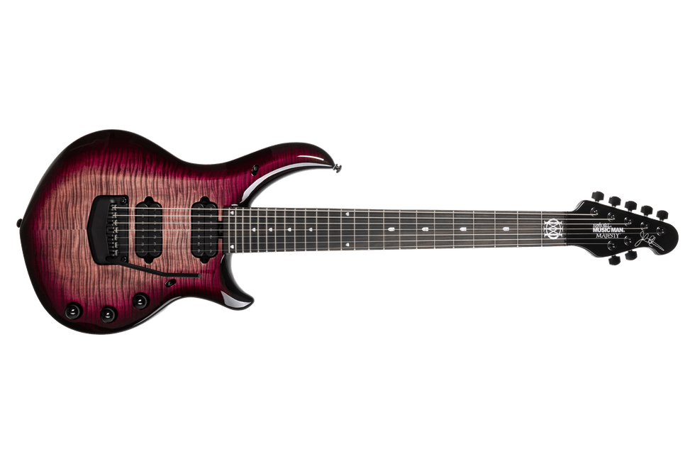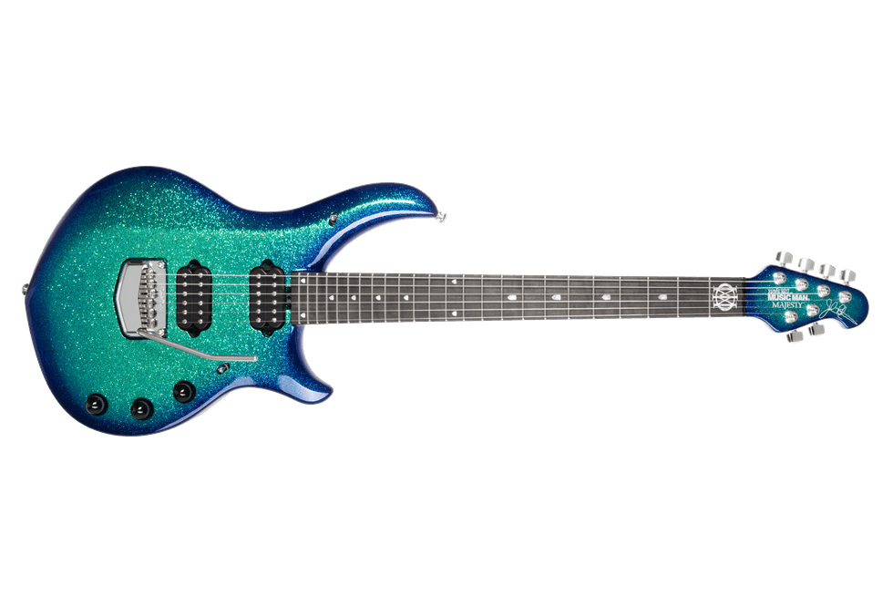 The John Petrucci Signature Majesty Premium Select delivers refined tone, precision, and versatility at the highest level—the culmination of years of touring and recording during which John Petrucci gravitated toward a mahogany neck-through body with alder wings and a thick maple top for added depth, sustain, and articulation. Features include a 24-fret ebony fingerboard with stainless steel frets, glow-in-the-dark side dots, DiMarzio Rainmaker and Dreamcatcher humbuckers, a piezo-equipped Music Man floating tremolo, stereo/mono outputs, and a 20+ dB onboard gain boost. Available in Carnelian Red, Ka'anapali Dream, Mystic Dream, Purple Nebula II, and Strawberry Moon.