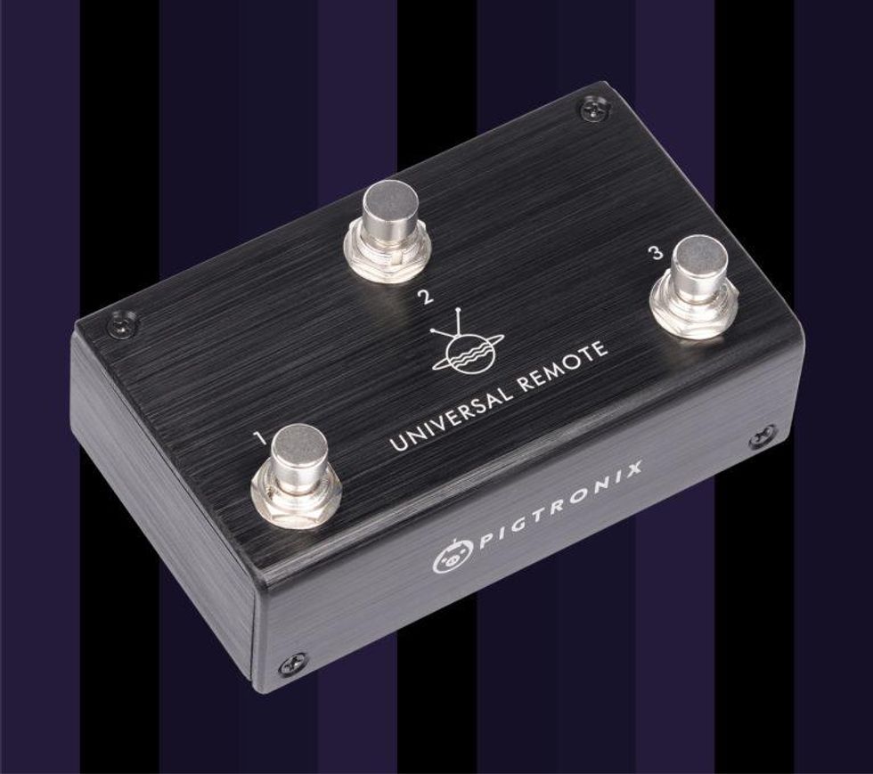 Universal Remote is a passive controller with three momentary footswitches that is compatible with a wide range of digital effects pedals from Pigtronix as well as other top manufacturers, allowing you to explore the full extent of your most robust effects. When connected to an effects pedal using a standard TRS ¼" cable, Universal Remote can perform three independent functions: Left footswitch shorts the Tip to Sleeve, the Right footswitch shorts the Ring to Sleeve and the Center footswitch shorts both Tip and Ring to Sleeve simultaneously. Housed in a sleek and durable brushed aluminum chassis with laser-etched graphics. The Universal Remote retails for $79 US MAP.