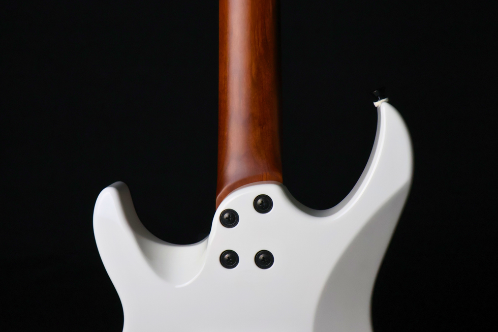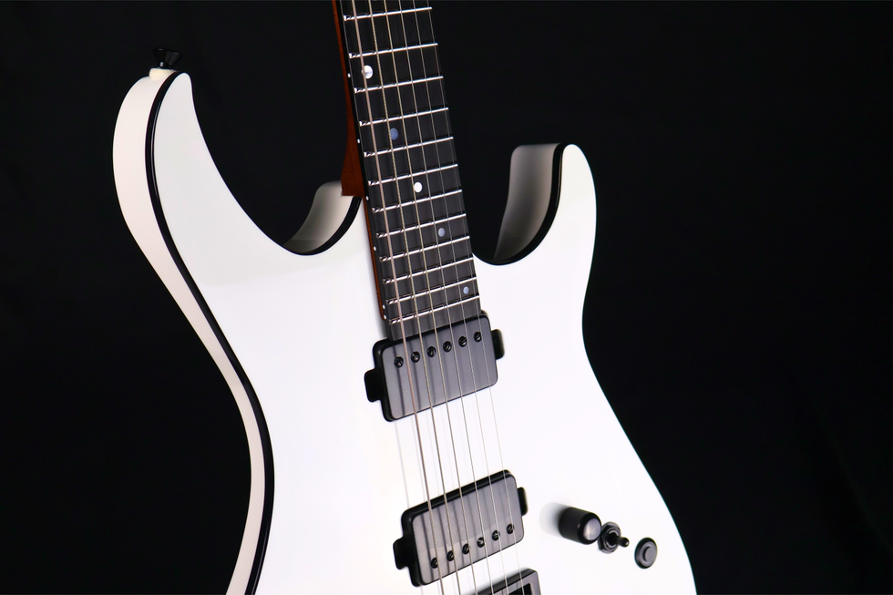 Featurin the Evertune bridge and paired with Gotoh locking tuners and a Graphtech nut for added consistency. The alder body is coated with an elegant white gloss finish and black binding for a timeless contrast. The bolt-on roasted maple neck features 24 medium jumbo stainless steel frets, providing longevity and durability. The neck also employs a Vola Modern C profile with a compounding thickness to further comfortability.