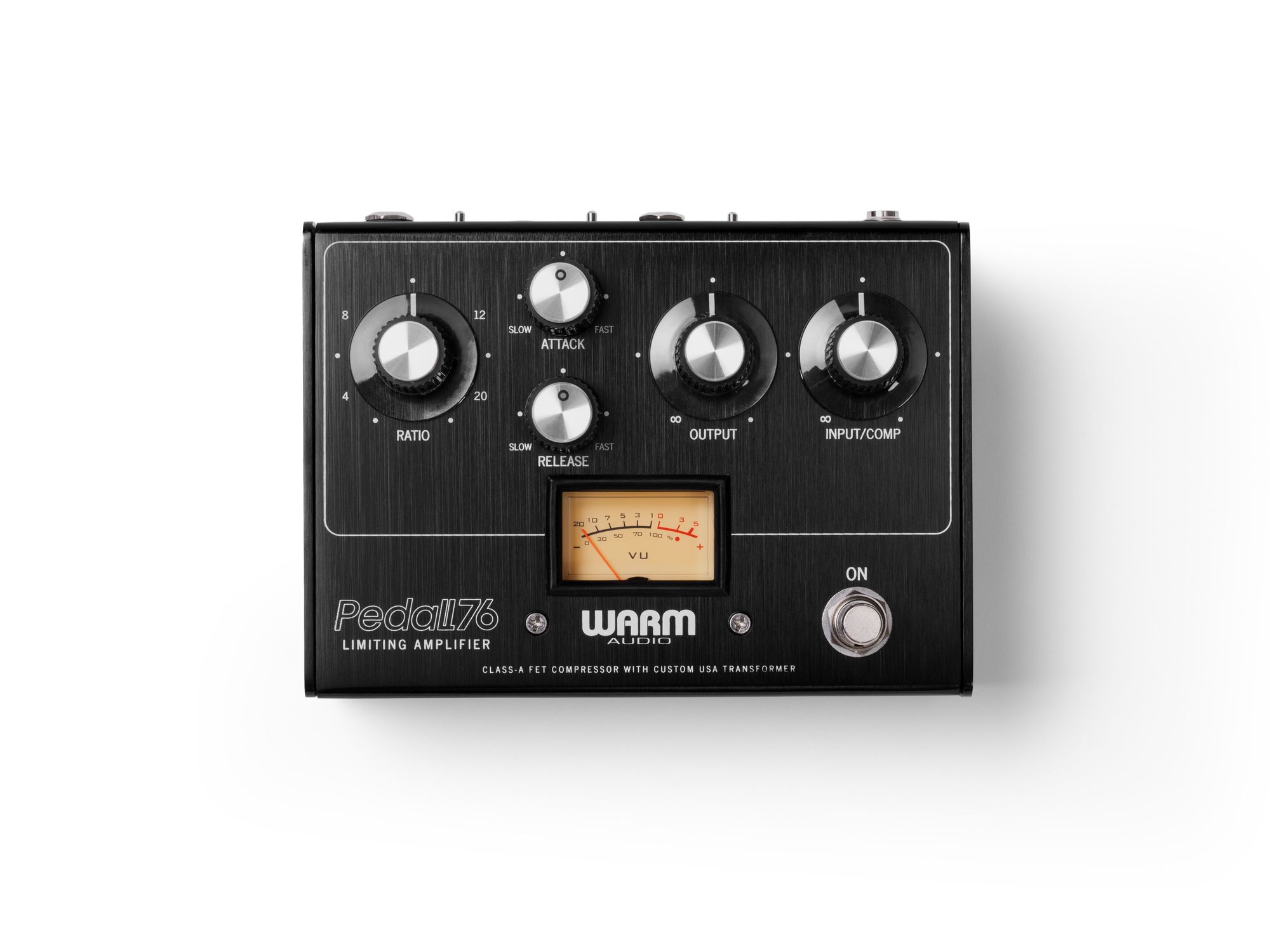 For over 10 years, Warm Audio has been building a premium, award-winning 76-style studio compressor, the WA76. With expertise in building this circuit and knowing what drives the sought-after tone of the most coveted dynamic control, Warm Audio now delivers truly professional, full-feature compression for the pedalboard. Pedal76 features a custom CineMagtransformer that is spec’d to duplicate the performance and tone of the studio units in a pedalboard-friendly format. Premium capacitors, resistors, and transistors round out a circuit that cuts no corners in delivering an authentic studio experience on stage. The added harmonic depth from the FET circuit and rich tone preservation from the custom transformer blend perfectly to recreate the ultimate compressor for guitar and bass players. Pedal76 features Attack & Release, Ratio, and Input controls, critical for taming unwanted changes in volume on stage. Pedal76 also has added features optimized for live performances including an external switch for true and buffered bypass operation, ensuring the compressor plays nice in your rig. Switches for input sensitivity, ground/lift, pad engagement and high/low gain modes (both for DI operation) provide added utility at gigs or in the studio. The separate balanced (DI) out also sends proper signal to the mixer or live recording rig, with the high gain mode adding grit and rich transformer tone.