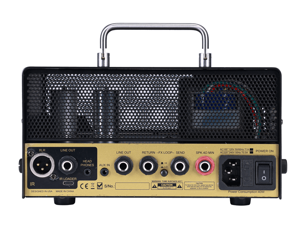 The rear panel of the Lead Burner expands its versatility for recording, monitoring and live use. An IR XLR balanced output allows direct connection to mixers, audio interfaces, or front of house systems, while an unbalanced IR LINE OUT supports monitors or the high-Z inputs of PA systems. The IR LOADER port uses a Type-C connection for importing IR files from a computer, and a dedicated headphone output provides an IR-processed signal for silent practice. An AUX IN is available for audio playback. A separate LINE OUT without speaker simulation supports external power amps or additional IR loaders.