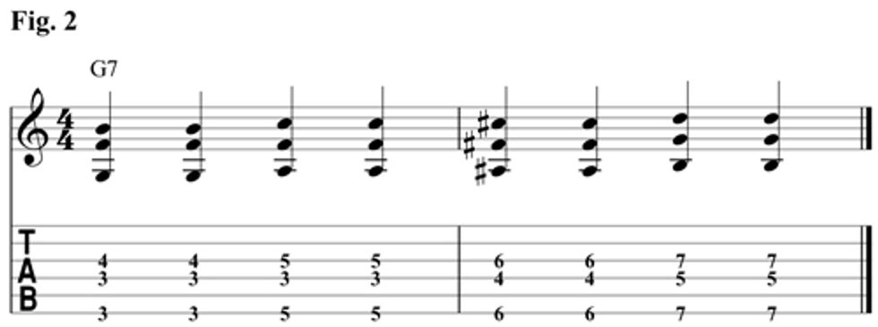 You can see in Fig. 2 how the walk-up works over two measures of G7. We take the shape that appears on beat 2 of the first measure and move it up chromatically. Now, let’s transpose the walk-up from G6 to C6, and then D7 as shown in Fig. 3. Again, it helps to angle your fretting hand so it naturally and easily mutes all the unwanted open strings.