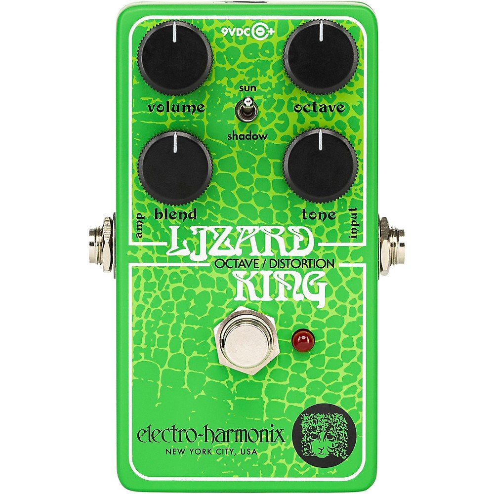 The EHX Lizard King is a fixed-gain fuzz that is dynamically responsive. Adjustments to your instruments volume affects the amount of fuzz. Lower instrument volumes create a clear, fuzzy overdrive, while full instrument volume sends the gain over the top for ripping riff and searing solo tones. The familiar VOLUME and OCTAVE knobs control overall output and octave blend volume respectively. New to the Lizard King, the BLEND knob sets the mix between your clean and fuzz tones to create the perfect balance of fuzz while retaining your bass’s attack and low-end. The TONE knob is a low pass filter that rolls off the highs, while the SUN/SHADOW switch further enhances the tone of the octave fuzz and clean tones. SUN boosts the octave fuzz with a more driving midrange, and the clean tone accessed by the BLEND knob has more treble and bass frequencies. When the switch is set to SHADOW, the clean tone is unchanged, and fuzz tone is tighter.