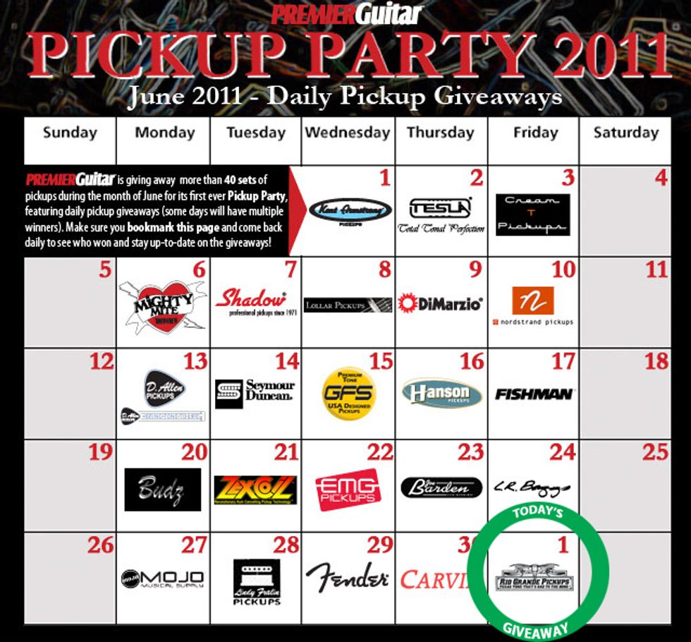 Premier Guitar and various pickup manufacturers are giving away over 40 sets of pickups in the month of June on PremierGuitar.com with Pickup Party 2011! Check out the interactive calendar below to see participating manufacturers and their respective giveaway dates. Make sure you bookmark this page and check back regularly to keep tabs on the Pickup Party and to see who the winners are.