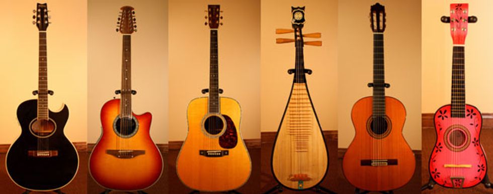 ![]() ACOUSTICS (from left to right): Washburn EA20 Acoustic Electric (1990s), Ovation CC245 Celebrity 12-String (2000s), Martin D-42 Acoustic (2000s), Chinese Pipa (1990s), Ramirez Classical (1990s), Mexican Miniature Acoustic (2000s). |