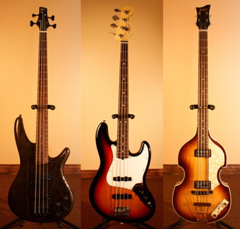 ![]() BASSES: Ibanez Soundgear 4-String Bass (Green, 2000s), Fender American Standard 4-String Jazz Bass (Tobacco Sunburst, 2000s), Hofner 500/1 Vintage '63 Reissue Beatle Bass (2000s). |