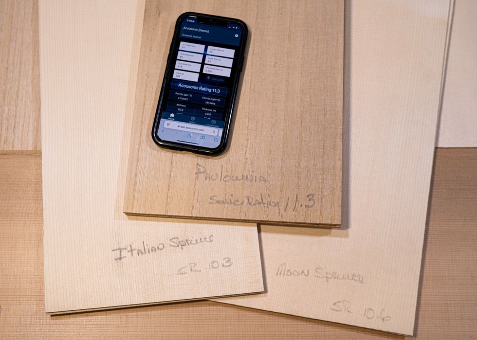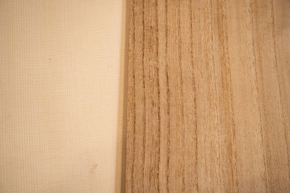 To better understand how this gracefully curved structure works, consider the practicalities of how a guitar top is constructed. From a board, a very thin sheet of wood is cut. Typically, two or more pieces are joined together edge-to-edge in order to provide the most predictably uniform wood grains across the width of the guitar. This top usually has what's known as quartersawn grain orientation for maximum strength and consistency, with the growth rings of the wood perpendicular to the guitar's face, as if the hard grain lines were miniature structural beams.