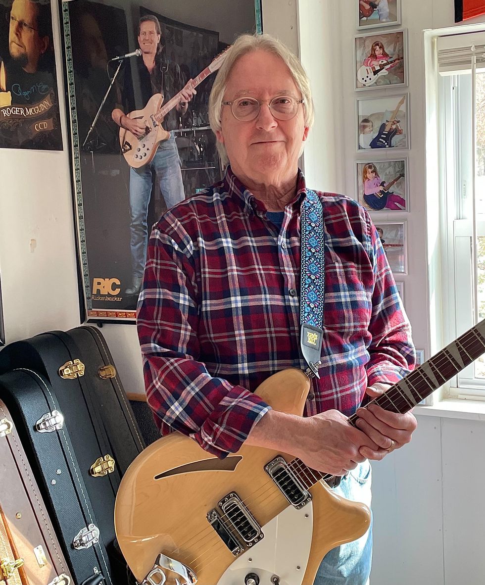 My musical obsessions center around my love of guitars. It was hearing The Byrds’ Mr. Tambourine Man and seeing Roger (then Jim) McGuinn playing that Rickenbacker 12-string that made me want to play guitar. I started taking lessons, and even had a pair of those McGuinn “granny glasses.” Since then, I’ve acquired many guitars (mostly electric) and, of course, had to have a Rickenbacker (I have two: a 36012-string in jetglow, and a 360 6-string in mapleglow, like Roger’s). I currently play in a local band, Stark Raven, mostly for fun, and love playing any type of guitar rock!
