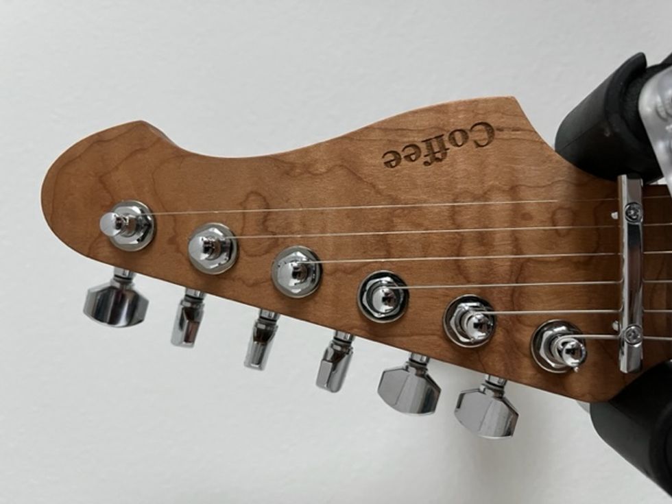 The name “Coffee,” which is laser-engraved on the headstock, was inspired by the look of the roasted parts of the guitar, because the color reminds me of an old coffee pot. My original vision was that when I have the blues, I can grab my Coffee, and everything will feel good again.