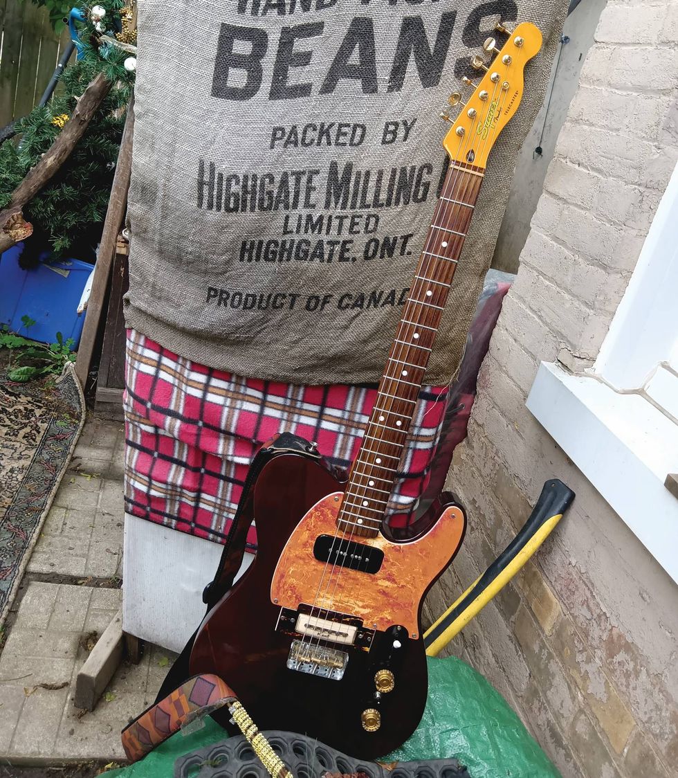 The pickguard, made by Greasy Grooves, is designed to resemble rust. I had hoped to match the cherry red of George Gobel’s Gibson L-5 but couldn’t find the exact color, so I used burgundy leather dye and five coats of lacquer. The result, which I call the “Alcaster,” looks like black cherry. The whole guitar comes in at a light 7.5 pounds. With D'Addario .011-.049s, the guitar delivers a Les Paul-like tone on the neck pickup, while the combined sounds go from round to Howlin’ Wolf.