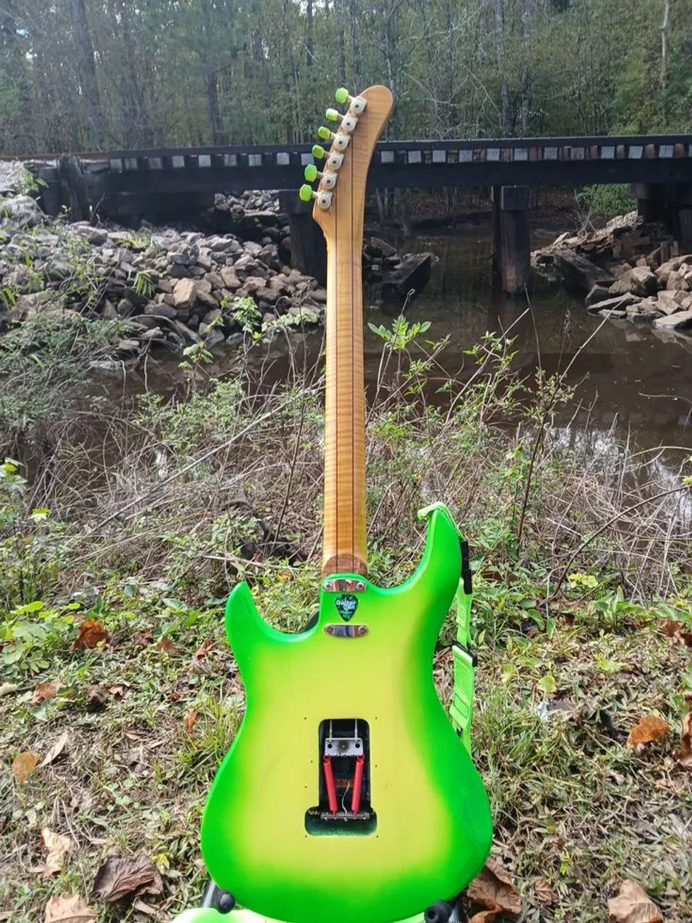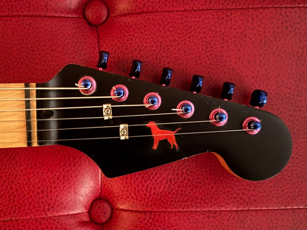 I call this guitar "The Wizard." The inlays on the neck explain everything. This is a Warmoth bird's-eye maple neck that started its life in 1990. It was part of a kit I was building with a Warmoth quilted-maple body. I had Dave's Guitar Shop in La Crosse, Wisconsin, paint it a purple sunburst with clear center. After assembling the guitar, it just didn't vibe with me. The guitar sat for a few years and was more art than guitar.