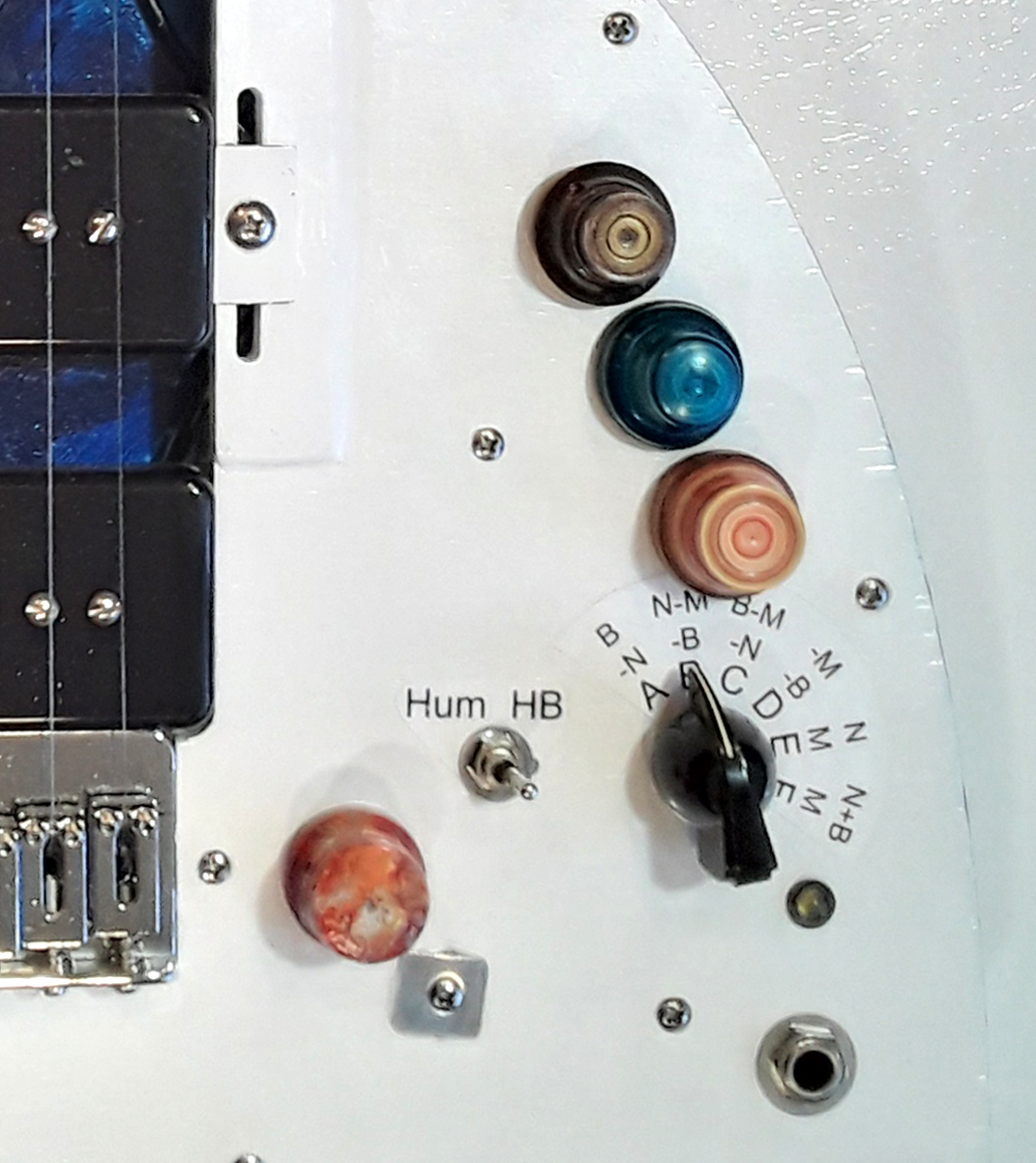 The first prototype, a white guitar, has three P-90s with N, S, and N poles up, bridge to neck, tone pots for each pickup, a 6-way switch with a 2-way mode switch (HB and Hum), a preamp to equalize the output amplitudes with switching, a volume pot, a moveable middle pickup, and a power LED which lights with the preamp when the guitar cable is plugged in. The second prototype, a black guitar, has three Allparts Vintage Chrome humbuckers, phase reversal switches on the neck and bridge tone pots, pickups moveable to any place between the neck and bridge, and over 20 distinct circuits.