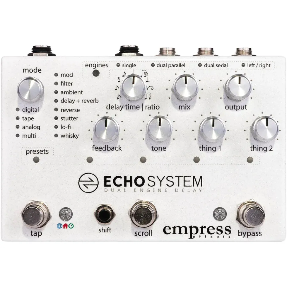 With over 40 different algorithms, including reverb, filter, and reverse options, this is a fully featured delay system. It also has stereo ins and outs and the ability to run two delays at once.