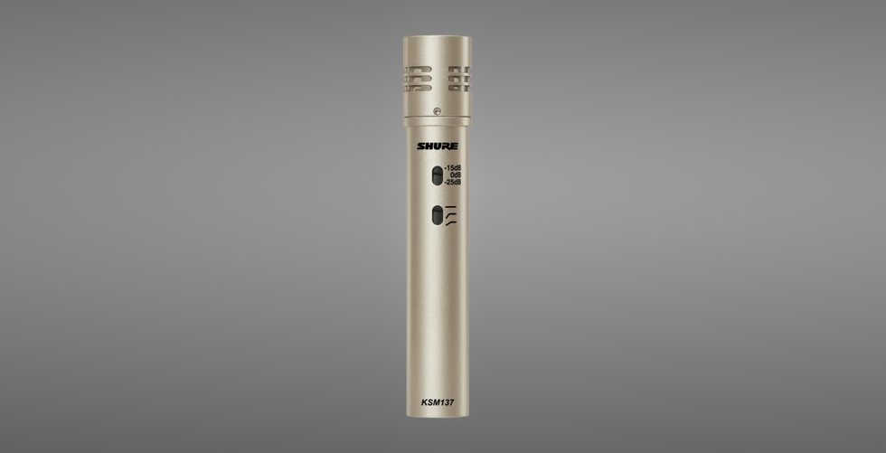 A matched pair of these ubiquitous condenser mics works wonders on piano, acoustic guitars, and even drum sets. The KSM137s sport a gold-layered Mylar diaphragm, subsonic filter, and a 3-position pad.