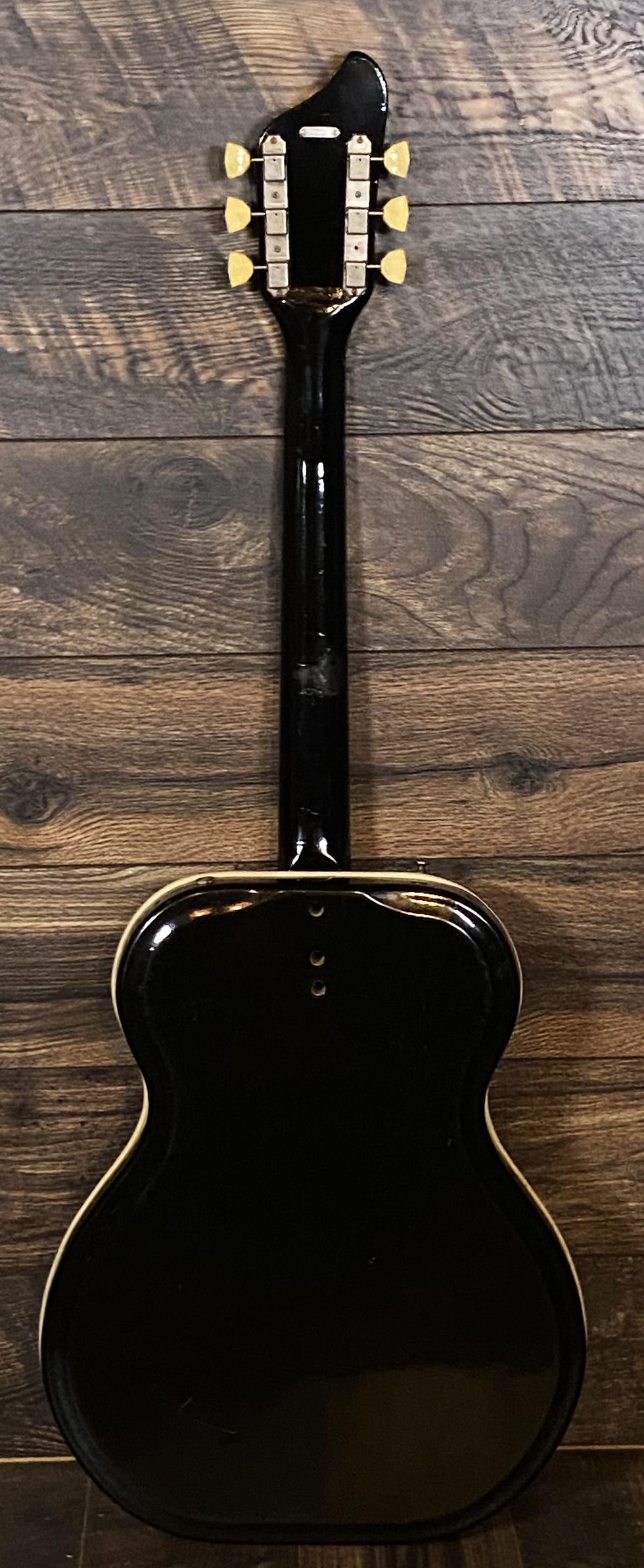 This example was assembled at the Valco factory as a hybrid of Airline and Supro body parts. During a slight neck repair at Nashville Used and New Music, its original red neck was refinished black to match the body.
