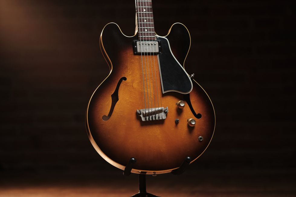 The Gibson EB-6 was announced in 1959 and came into the world in 1960, not with a dual-horn body but with that of an elegant ES-335. They looked stately, with a thin, semi-hollow body, f-holes, and a sunburst finish. Our pick for this Vintage Vault column is one such first-year model, in about as original condition as you’re able to find today. “Why?” you may be asking. Well, read on....