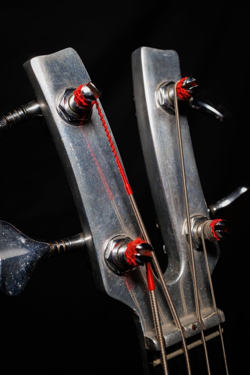 The thick ebony board is bound and inlaid with shaped pearl pieces and dots, while the headstock is overlaid with Brazilian rosewood, accented with a pearl floral pattern inlay. The tuners are engraved ivoroid-button strips typical of the period. A number of Stahl guitars of this pattern are known, including one rather famous example with a colorful history of ownership by Eric Clapton, Jimi Hendrix, and Felix Pappalardi of Mountain, who used it on the evocative song “The Laird” from Mountain Climbing!
