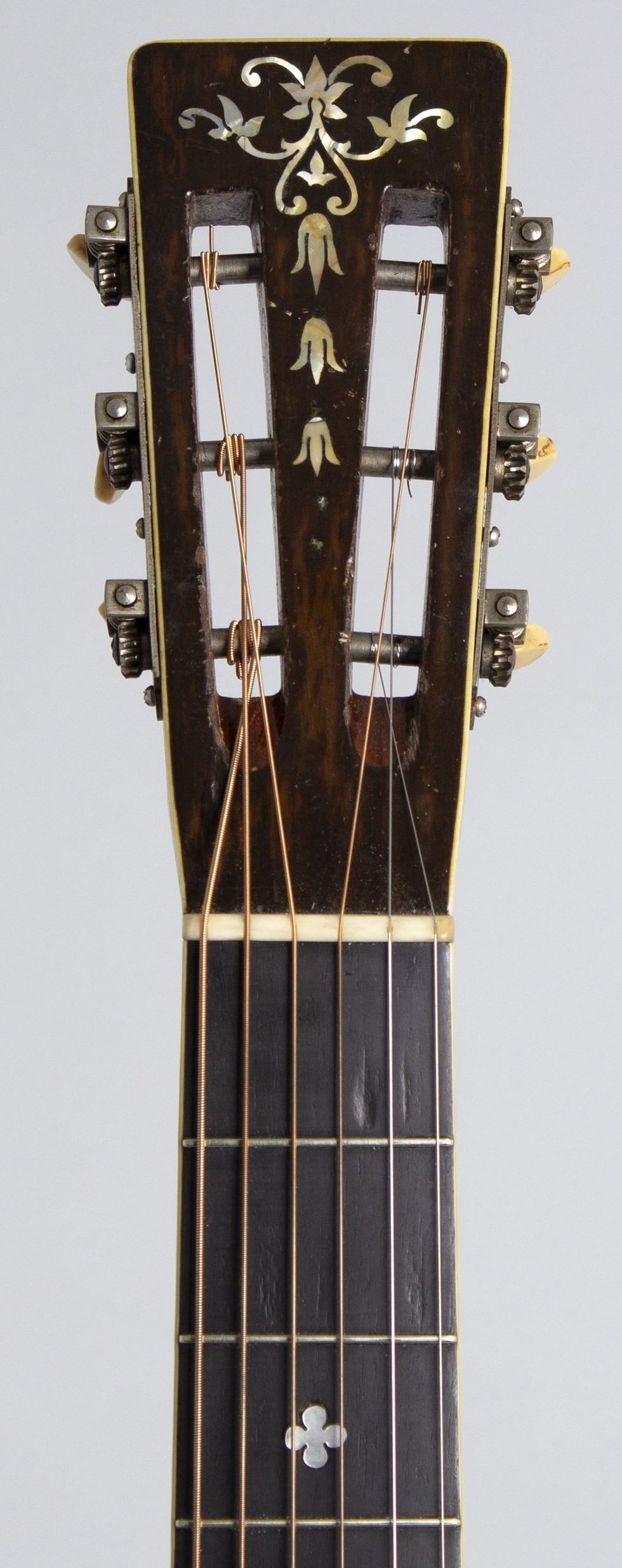 Some Stahls carry a paper label; others, like this, show a “Wm. C. Stahl, Maker, Milwaukee” hot stamp on the back strip. Stahl’s 1912 catalog offered a range of guitars; this most resembles the Solo Style 8. According to Larson historian Robert Carl Hartman, the serial number indicates that it was constructed in 1927. A 12-fret, 13 1/2″-wide concert-size guitar, it sports many typical higher-grade Larson appointments. The back and sides are Brazilian rosewood, with more figure than the straight grain Martin preferred. The spruce top has laminated X-bracing; many Stahl guitars did not. August Larson may have originally intended to reserve his patented system for his own wares, but perhaps by the 1920s, the distinction was lost.