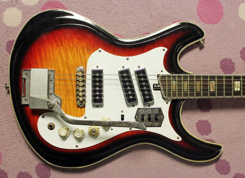 This Silvertone 1445 model hails from around 1969. It’s a cool 3-pickup model that features an offset shape with some exaggerated lines. Built at the Kawai factory, the guitar has an ebony fretboard and some standard Kawai appointments, like the in-house vibrato, electronics, and pickups. There is an on/off mini switch and volume knob for each pickup as well as a single tone knob. Around this time, Kawai was starting to cut corners in subtle ways, one of which included underwinding the pickups, which, in most cases, resulted in a thinner sound. Luckily, the series wiring in these guitars can produce quite the powerful sound. The finish is a nice-but-kinda-blah sunburst with some flamed wood. The flame veneer was a new thing for the Japanese guitar makers at the time, and I think there was some elegance attached—especially for a guitar targeted toward beginning players.