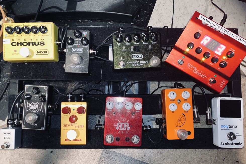 His guitar signal first hits a vintage Dallas-Arbiter Fuzz Face, then proceeds to a Texadelphia Germanium Booster, a Sir Henry Uni-Vibe clone, a Metropoulos Supa-Boost, a Peterson StroboStomp HD, a Maxon AD999 Analog Delay, and a Hamstead Soundworks Signature Analogue Tremolo.