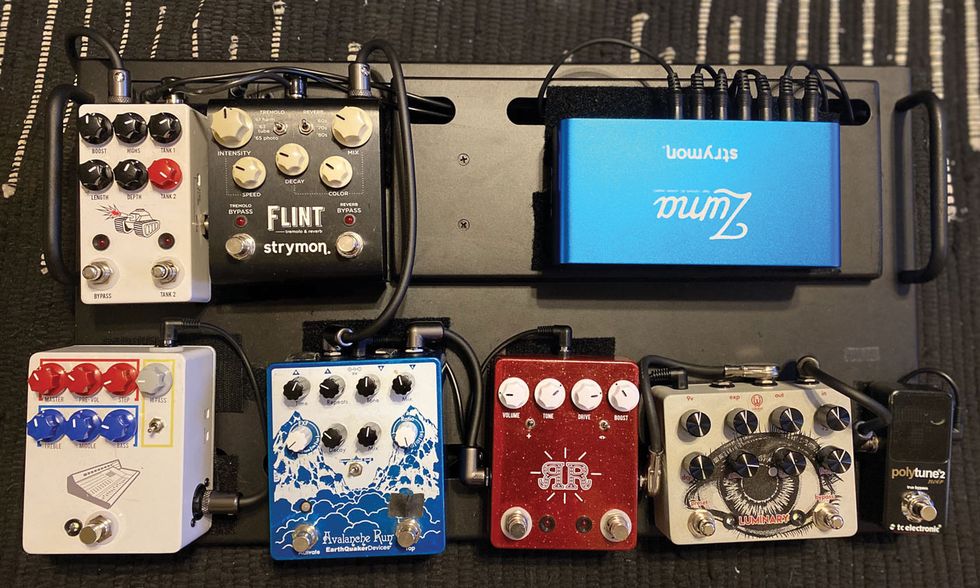 Post-rock instrumentalist Phil Jamieson’s most recent live board features four main food groups—dirts, loopers, delays, and reverbs—plus Electro-Harmonix Voice Box and MEL9 pedals for a snack. A Boss GE-7 graphic EQ—used for a clean boost with low-mid punch—is always on, while a Strymon Sunset and an Empress Heavy provide three layers of beef.