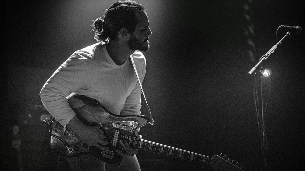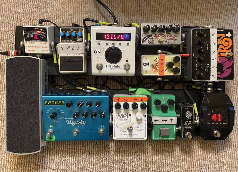 For unusual sounds, he calls on a Boss DD-7 Digital Delay’s reverse mode, a Strymon BigSky’s shimmery reverb, and an Eventide H9’s choppy tremolo. Auxiliary funkiness comes via Electro-Harmonix Q-Tron and MEL9 pedals (he loves the latter’s choir setting), as well as a ZVEX Lo-Fi Junky. Rounding out the collection are an Ernie Ball VP Jr. volume pedal and a footswitchless Boss TU-3S tuner.