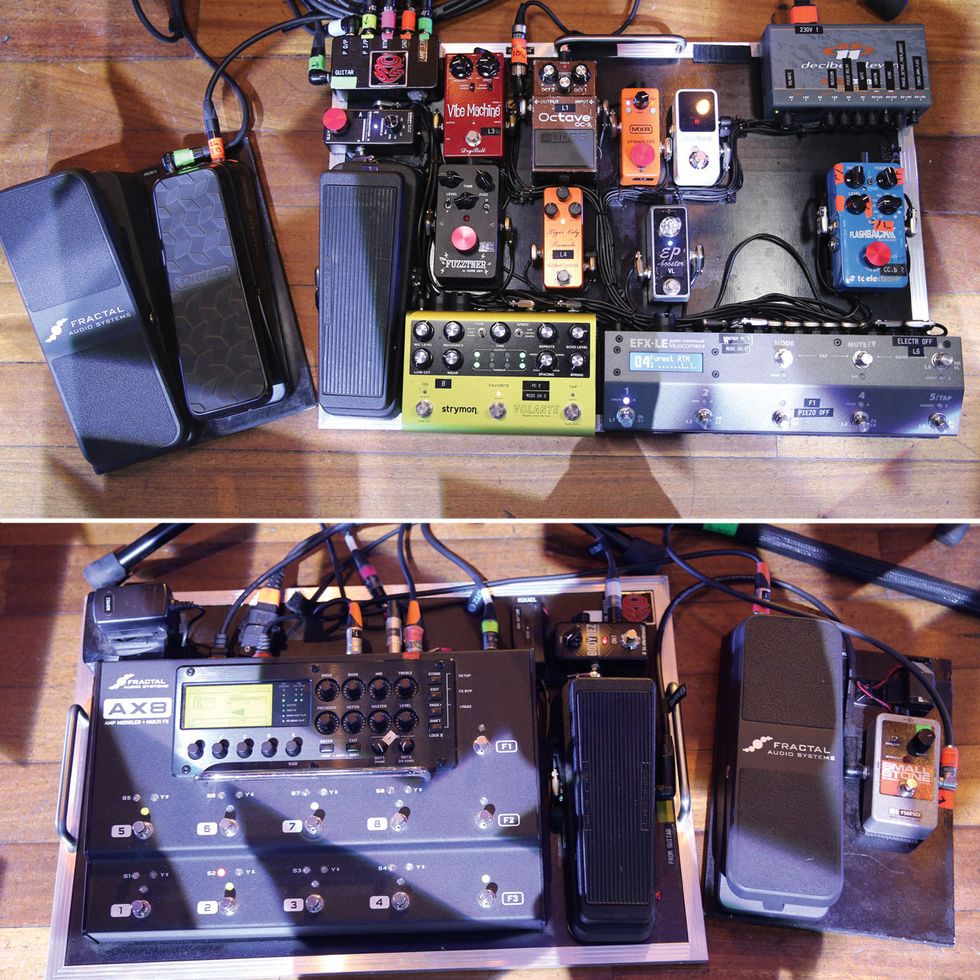 Opeth frontman Mikael Åkerfeldt, meanwhile, takes a much more streamlined approach to effects—at least in terms of the number of discrete boxes. His pedalboard consists of a Fractal Audio AX8 augmented by a Fractal expression controller, a Dunlop Cry Baby wah, an Electro-Harmonix Small Stone Nano phaser, and a TC Electronic BodyRez acoustic pickup enhancer.
