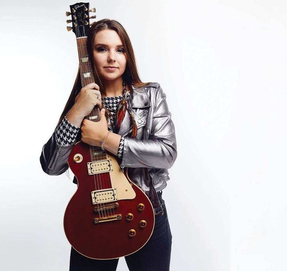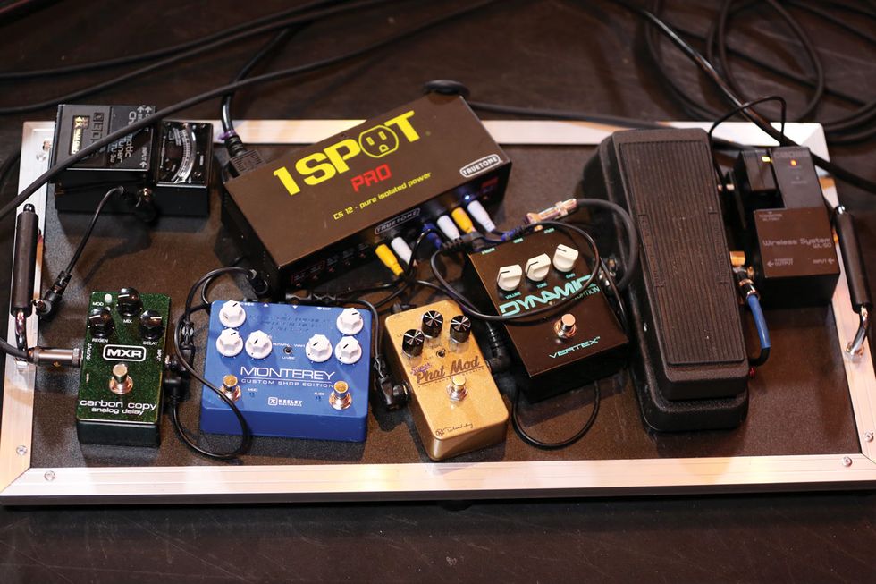 Her guitar signal hits the board coming out of a Boss WL-50 wireless, and immediately hits a Dunlop 535Q Cry Baby wah before moving on to a Vertex Dynamic Distortion, Keeley Super Phat Mod and Monterey pedals, and an MXR Carbon Copy delay. Power comes courtesy of a TrueTone CS 12 1 Spot Pro, and tuning is facilitated by a Boss TU-3W.