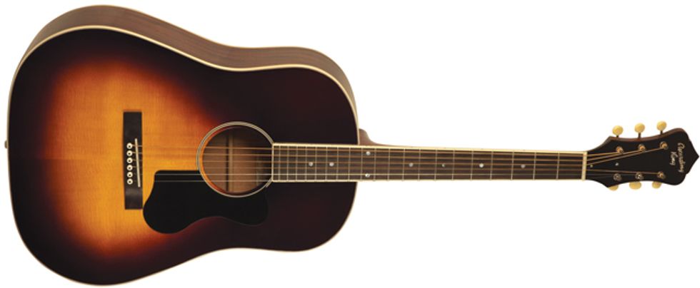 It's finished in vintage sunburst with a classic black pickguard, ivory Golden Age tuning machines and the historic Recording King headstock.