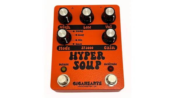 Usually, when I work on a fuzz review in my home studio, I wait until midday, take a peek out the front door to make sure that none of my neighbors are gardening or otherwise enjoying the peace of the outdoors, and then stomp away. But even these measures feel inadequate where the Gigahearts Hyper Soup is concerned. This Manchester, England, company’s take on the Shin-Ei/Univox Super Fuzz—or, more correctly, the Super Fuzz-inspired Boss FZ-2 Hyper Fuzz—is a beastly thing that thrives in high volume settings, just like its esteemed antecedents. But with a no-octave mode, as well as a mixed-voice mode that combines the mid-bumped and mid-scooped fuzz sounds, the Hyper Soup (what an excellent name!) achieves a malleability that the Super Fuzz, and even the FZ-2 with its EQ section, can’t touch. It even sounds superb with small amps at lower volumes that present little risk to the health and well-being of my kind neighbors.