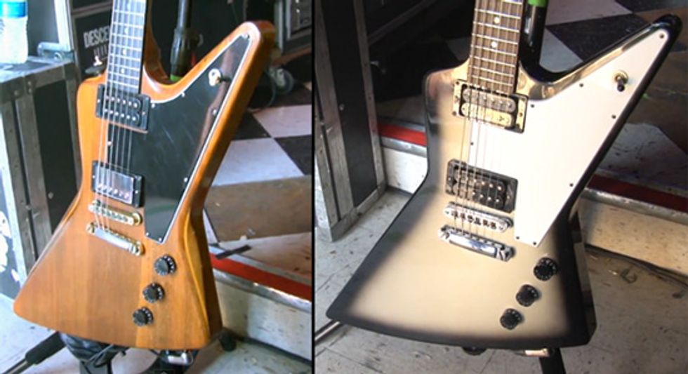 Claudio prefers Gibson Explorers, and his number one is a 1980 Gibson E2 Explorer (left). It has a Bare Knuckle Nailbomb in the bridge and stock neck pickup. The finish is sanded off the neck for speed, the electronics are upgraded with sealed pots, and the headstock has been broken and fixed. His second, most-used Explorer is a 2005 '76 Reissue with a calibrated set of Bare Knuckle Nailbomb pickups and the same electronics mods.