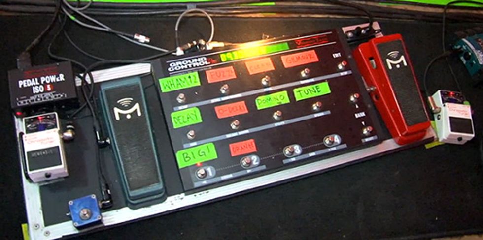The system is controlled with a Voodoo Lab Ground Control Pro with two Mission expression pedals for octave up and wah. He uses a Mission Tap Tempo pedal as well.