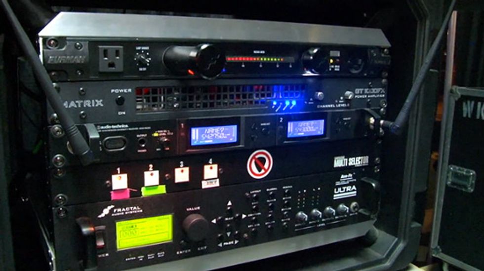 Travis' rig is the same as Claudio's: a Whirlwind Multi Selector, Audio-Technica wireless, and Fractal Audio Axe-FX Ultra. He only uses a few presets, his heavier sounds modeled after his Mesa/Boogie Mark Vs, and lead tones are more of a Marshall kind of lead with delay and reverb.