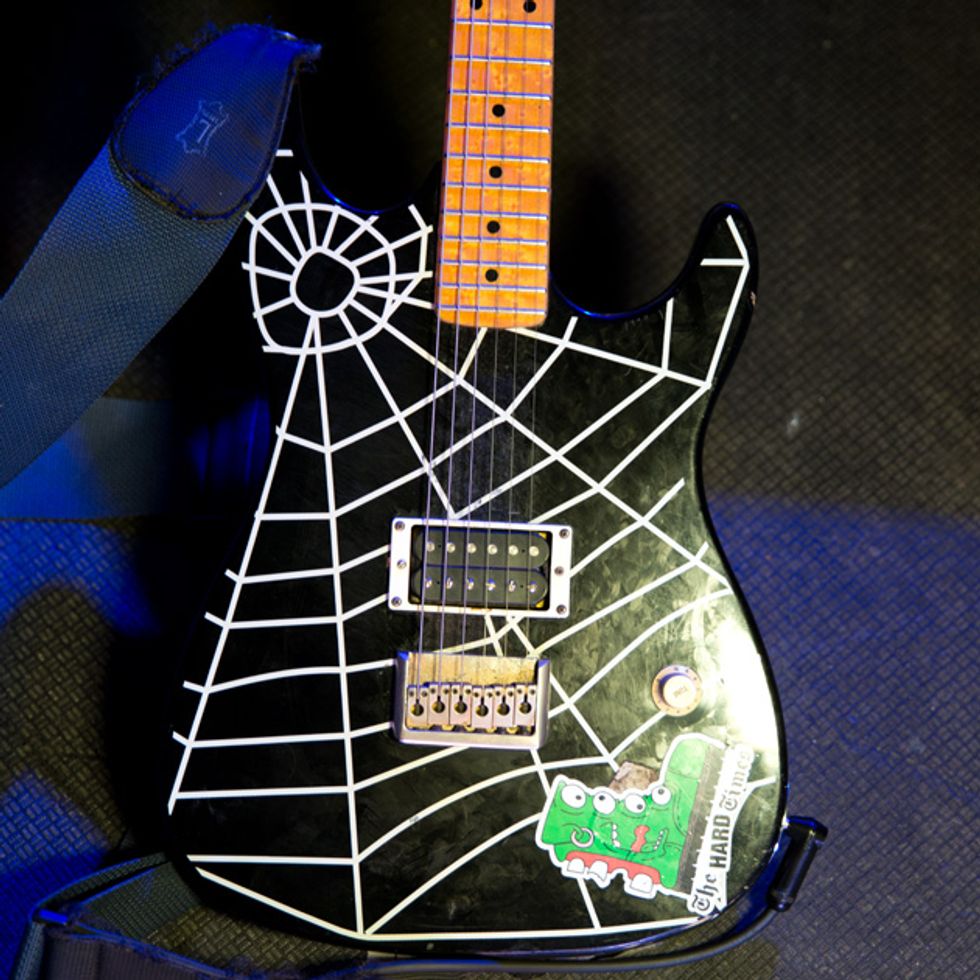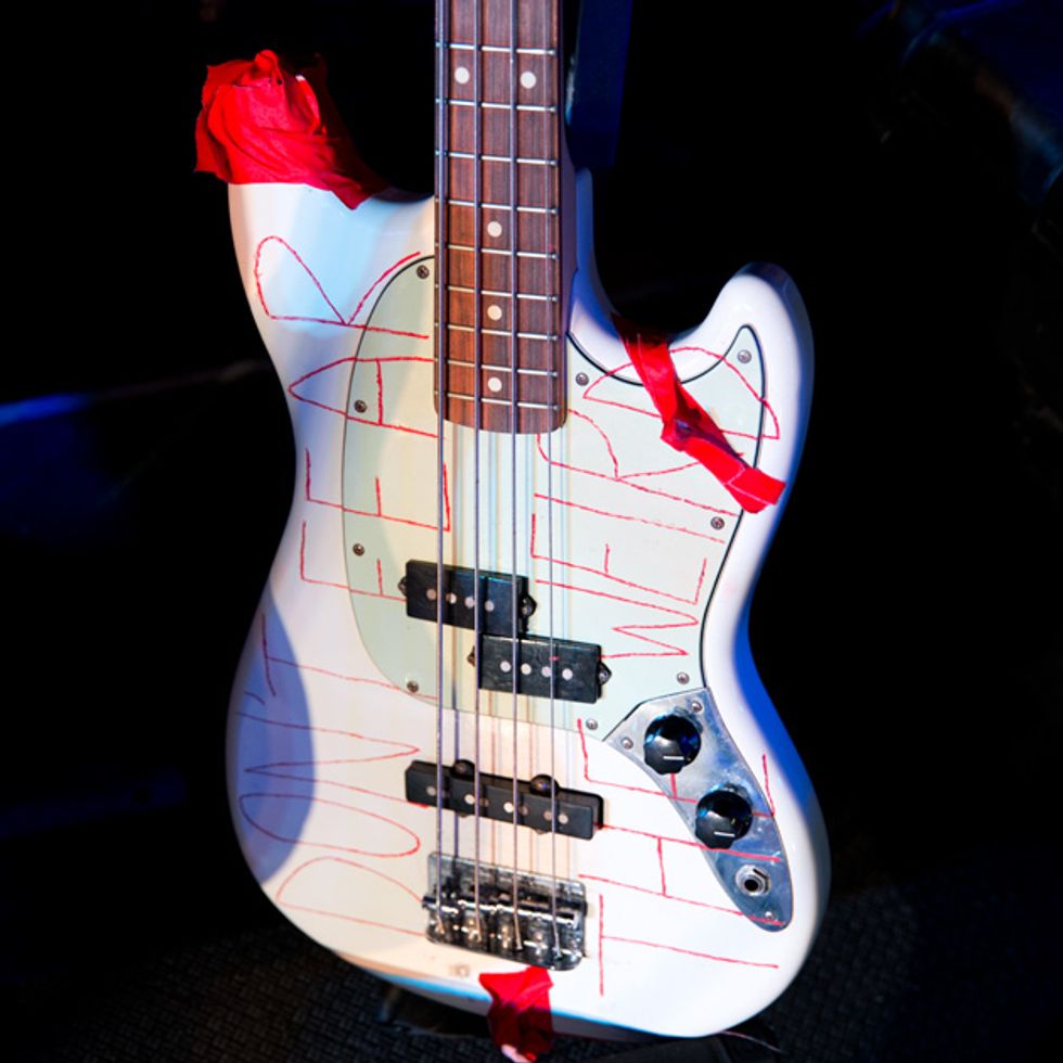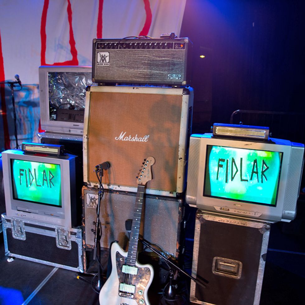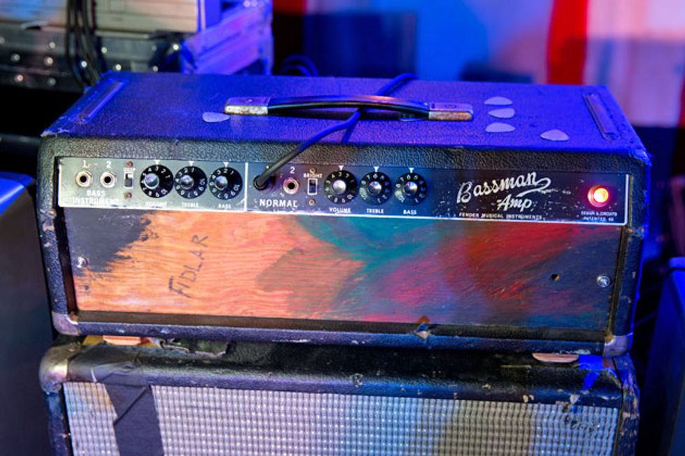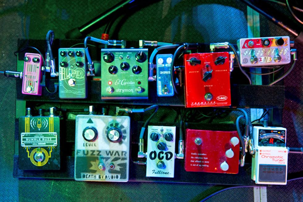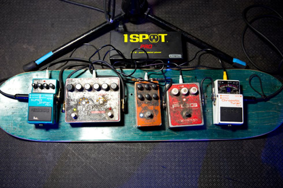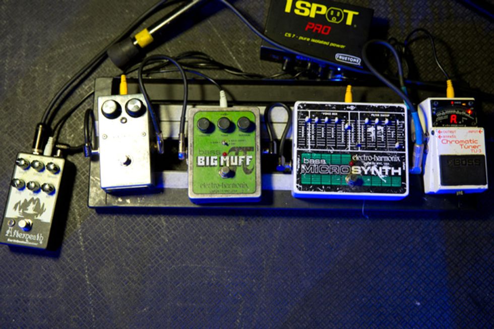 Brandon Schwartzel has a handful of noisemakers that include an EarthQuaker Devices Afterneath (for the pysch-jam parts), a custom one-off Creepy Fingers (Brad from Fu-Manchu’s company) pedal that says ‘Fidlar Brandon’ and acts like a bass distortion, an Electro-Harmonix Bass Big Muff, an EHX Bass Micro Synth, and a Boss TU-3 Chromatic Tuner.