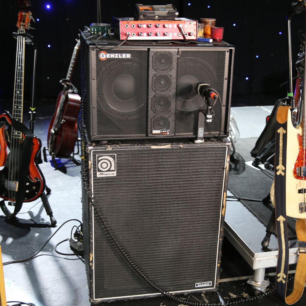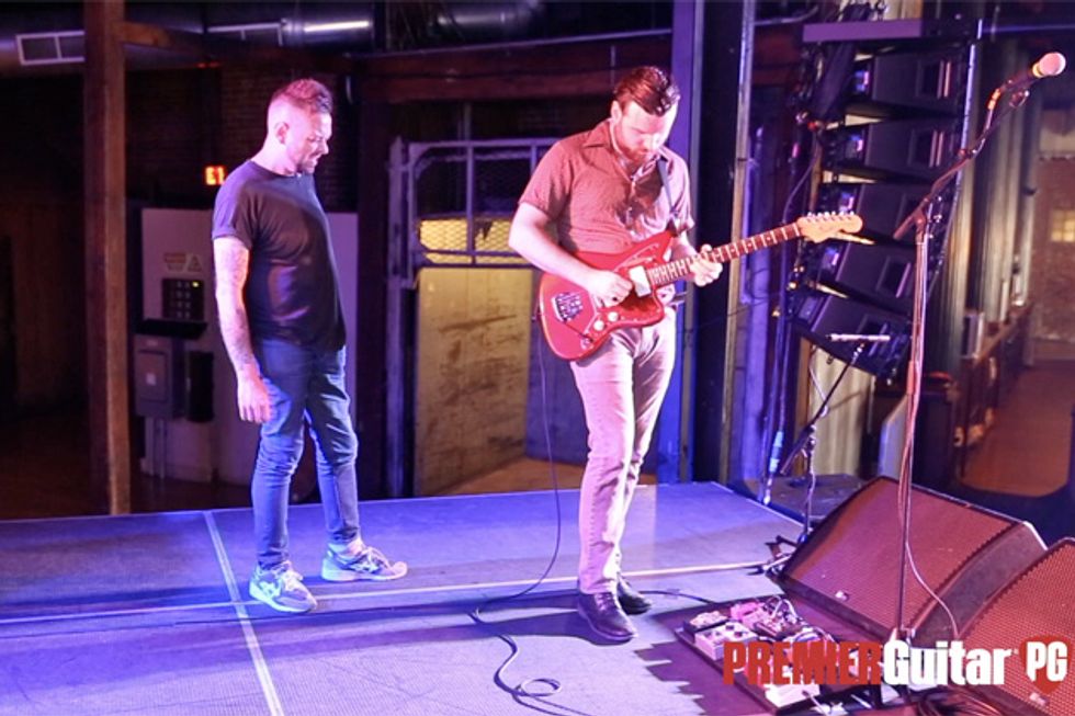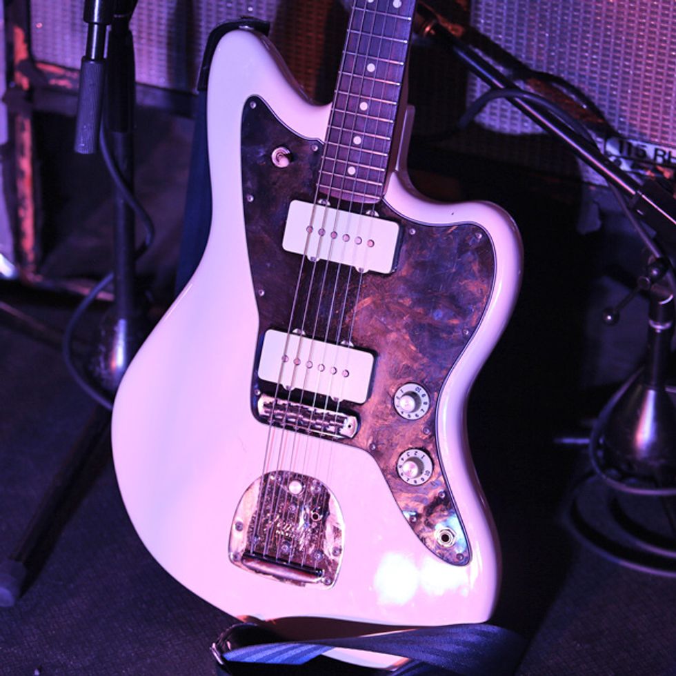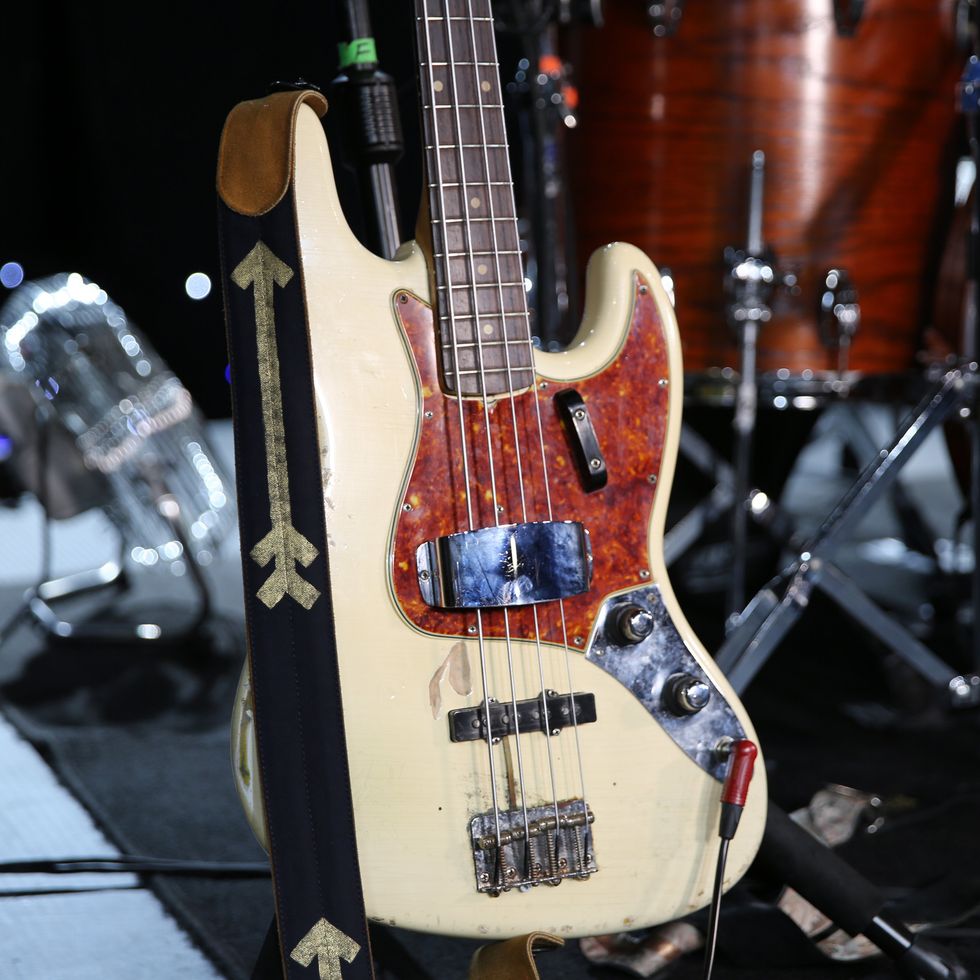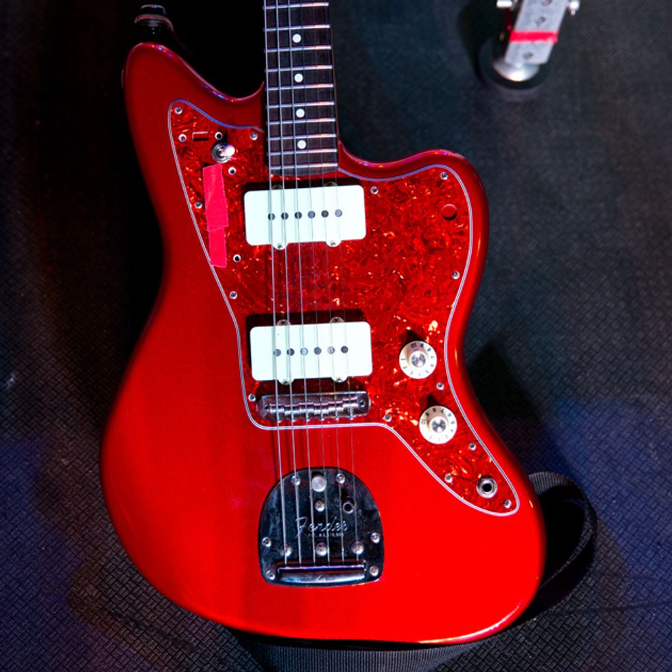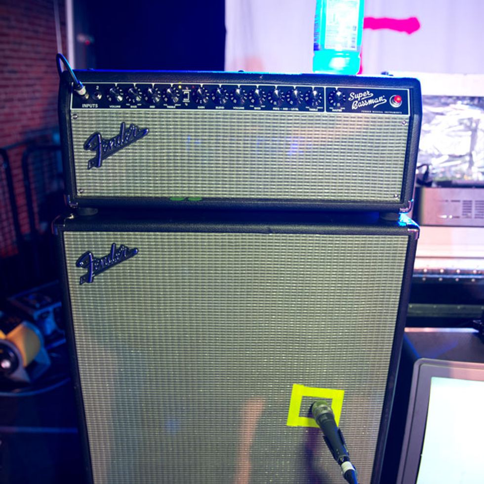 Brandon Schwartzel has a handful of noisemakers that include an EarthQuaker Devices Afterneath (for the pysch-jam parts), a custom one-off Creepy Fingers (Brad from Fu-Manchu’s company) pedal that says ‘Fidlar Brandon’ and acts like a bass distortion, an Electro-Harmonix Bass Big Muff, an EHX Bass Micro Synth, and a Boss TU-3 Chromatic Tuner.