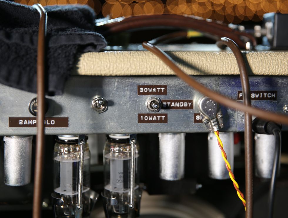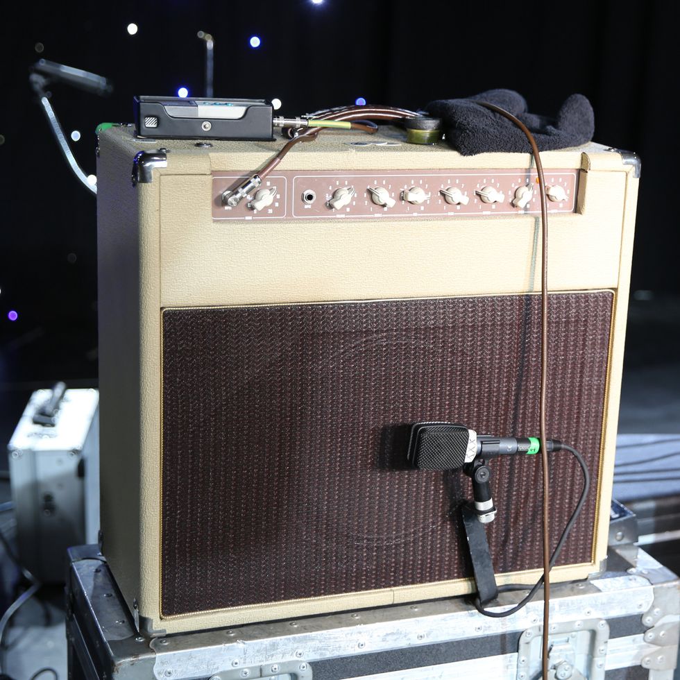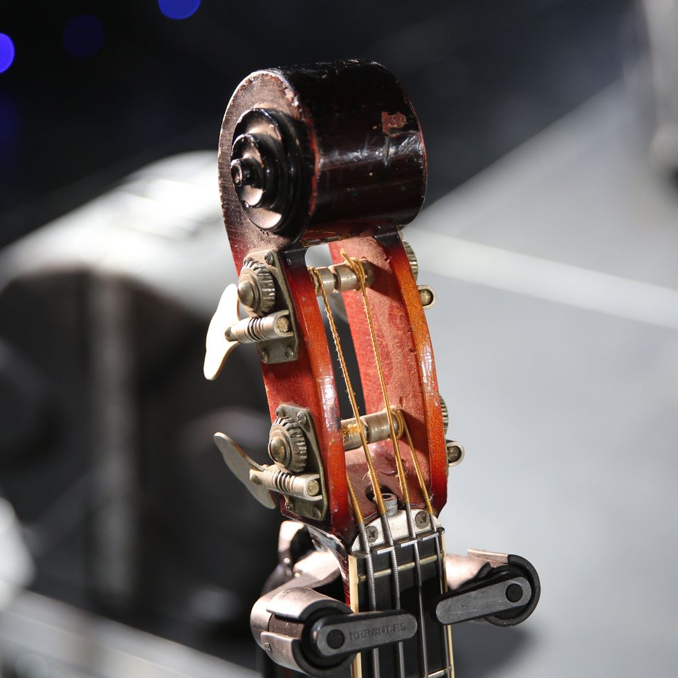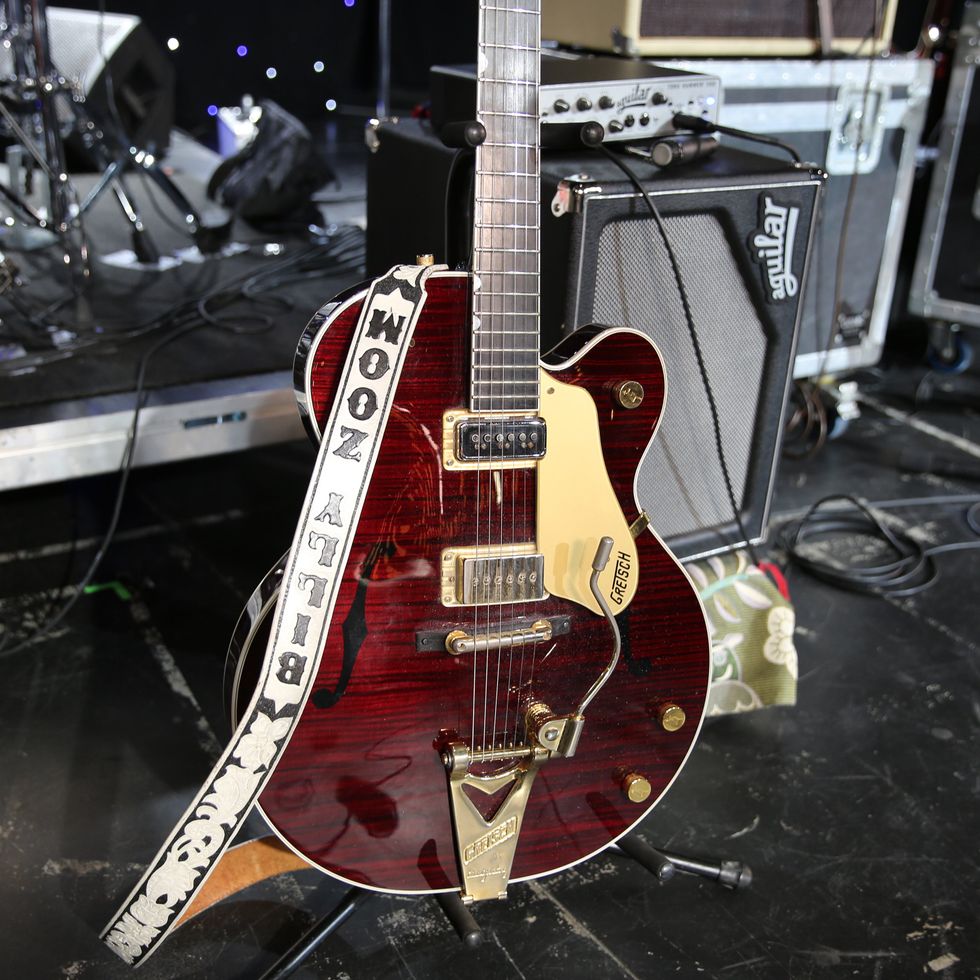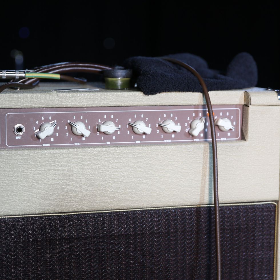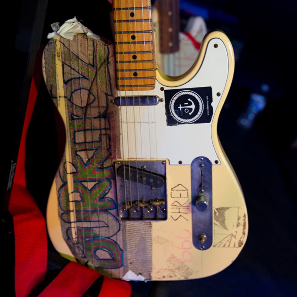 Brandon Schwartzel has a handful of noisemakers that include an EarthQuaker Devices Afterneath (for the pysch-jam parts), a custom one-off Creepy Fingers (Brad from Fu-Manchu’s company) pedal that says ‘Fidlar Brandon’ and acts like a bass distortion, an Electro-Harmonix Bass Big Muff, an EHX Bass Micro Synth, and a Boss TU-3 Chromatic Tuner.