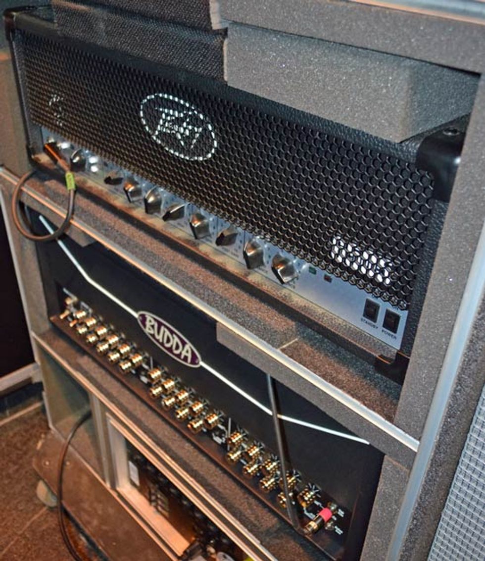 Sizemore depends on his “old school” Seymour Duncan Twin Tube distortion so much that he keeps three or four on hand in case one breaks. Other effects in his drawer include an Xotic Effects RC Booster, Budda OM Overdrive, TC Electronic G-System, and a Radial Tonebone Head Switcher that allows him to route his two amp heads (a Peavey 6505 and Budda Bully) through one cabinet: a Budda 4x12 cab with Celestion vintage 30 speakers.