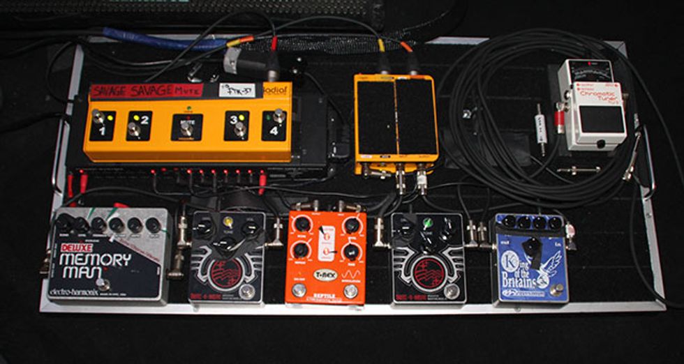 Chris uses an Electro-Harmonix Deluxe Memory Man, two Dr. No Ultradrives (used as a transparent boost for more sustain), T-Rex Reptile, and a Menatone King of the Britains pedal.