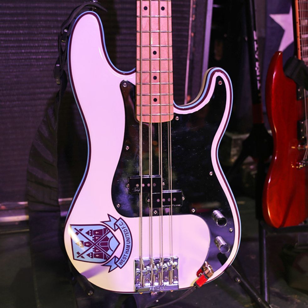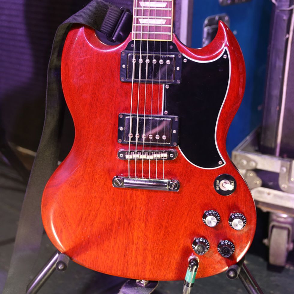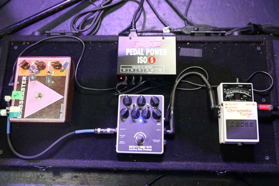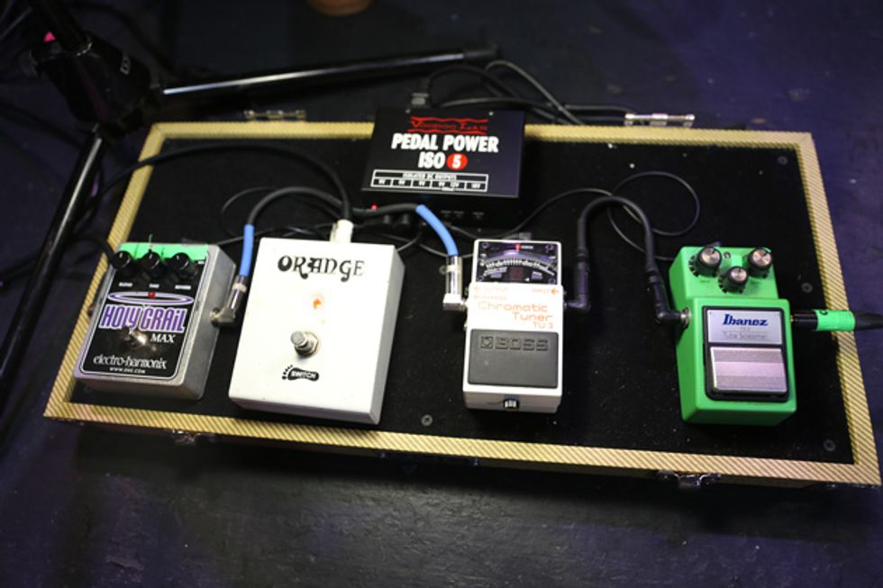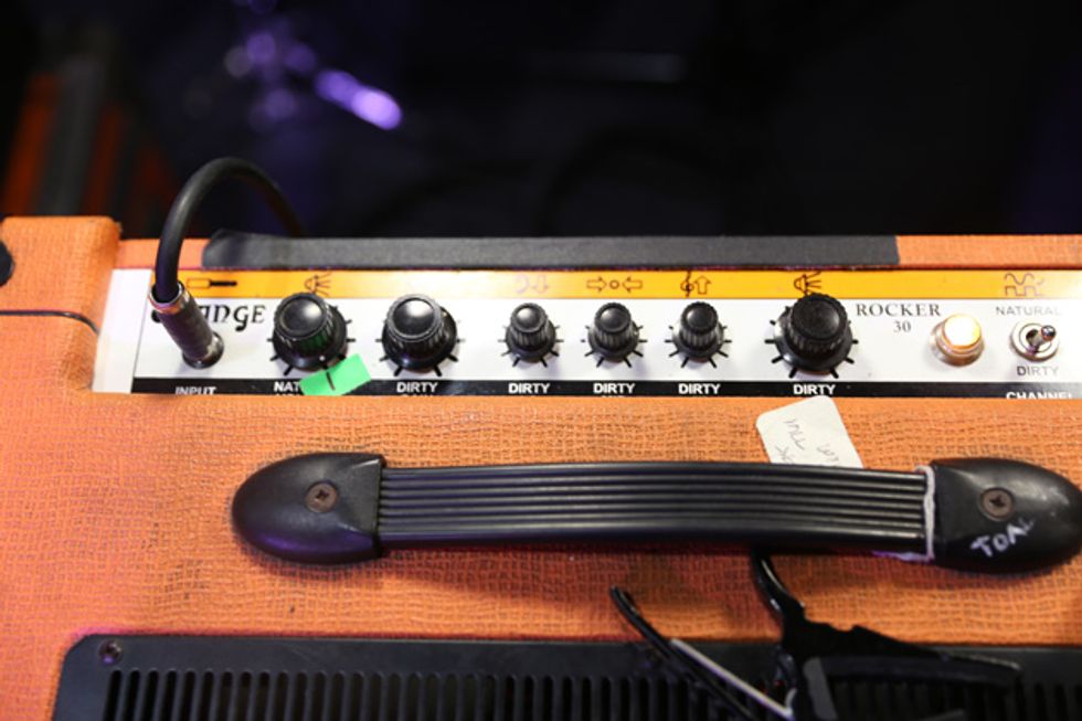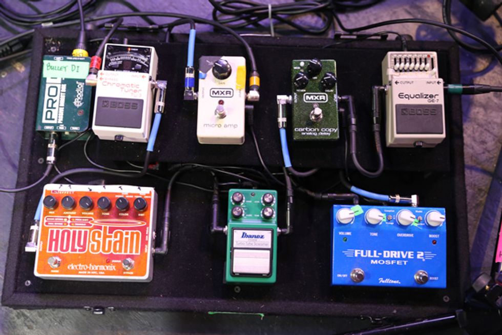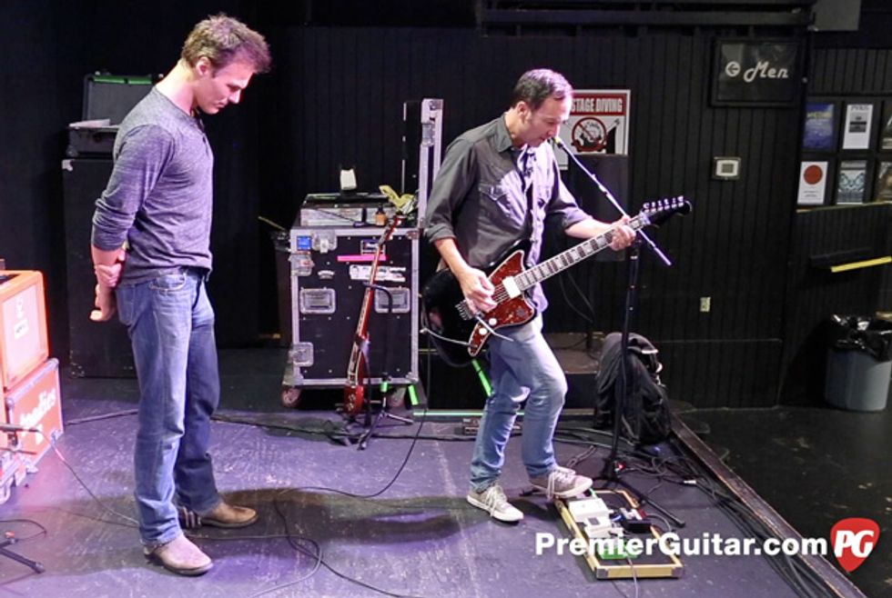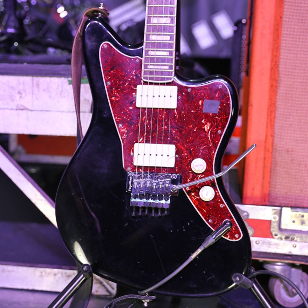 Clark Vogeler spends most of his time on this “parts” guitar he helped assemble. He started with a Warmoth Jazzmaster body that he routed out for a Floyd Rose tremolo. Next, he added a Warmoth Strat neck with a string lock. The last ingredients are two Seymour Duncan pickups.