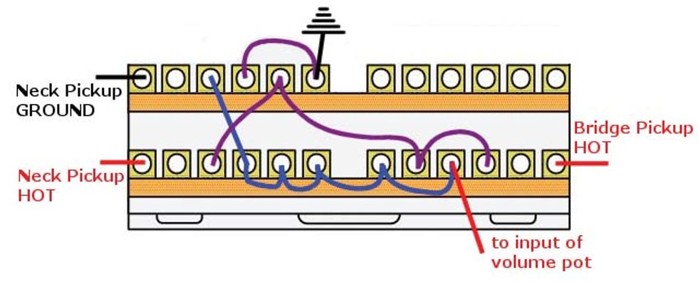 Fig. 1 shows how your new 5-way super switch should look after you solder all jumper wires. In this wiring scheme, the bridge pickup's black ground wire, as well as the new, third ground wire for the neck pickup's metal cover, go to ground. Be careful not to mix up the neck pickup's two ground wires. To be on the safe side, I find it helpful to choose a new color (perhaps blue or green) for the third ground wire attached to the neck pickup's metal cover.