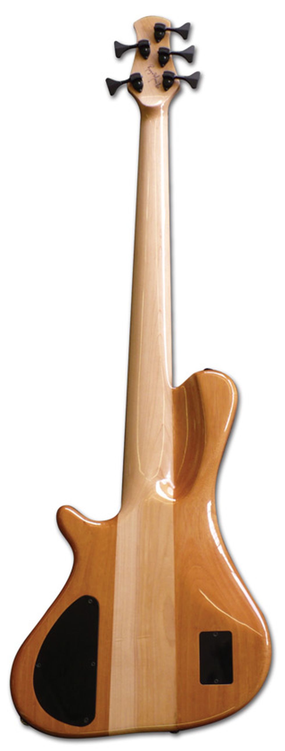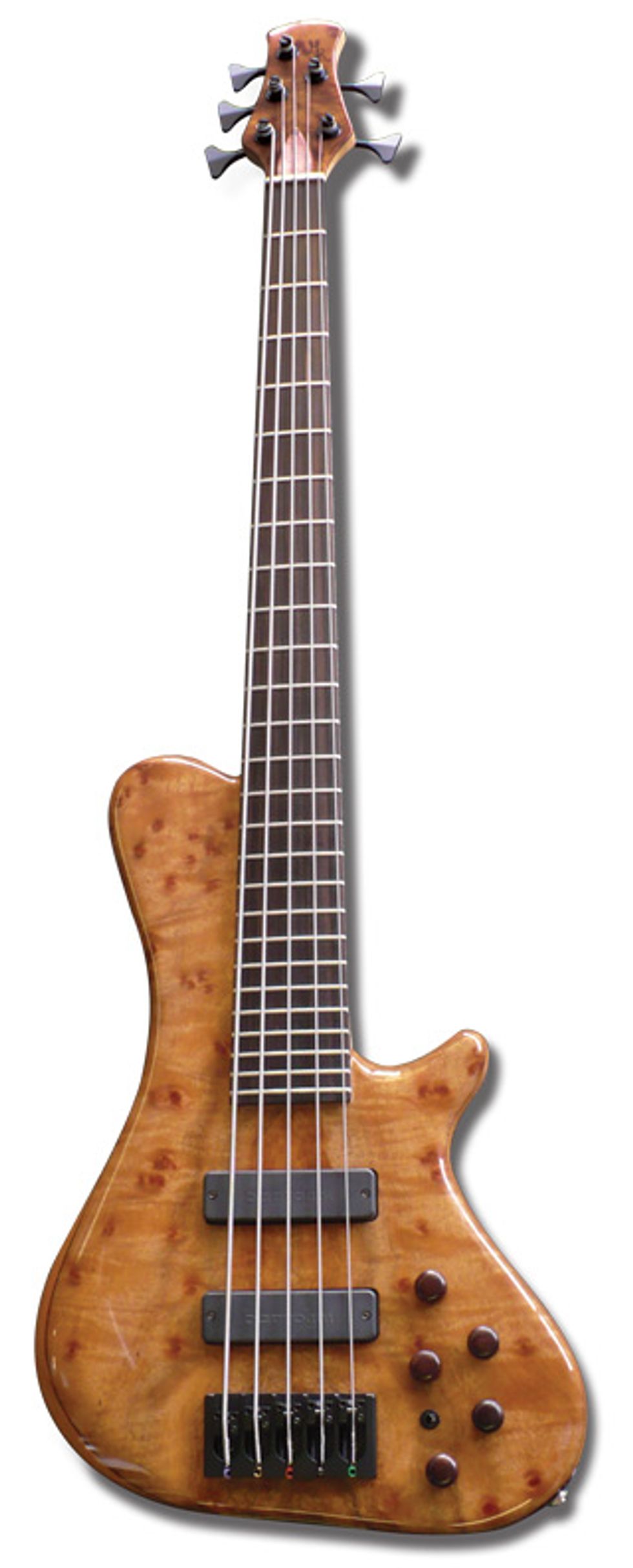 Answer: This bass by Roger Morillo, a luthier at St. Albans, West Virginia’s Fret ‘n Fiddle. The 35” scale bass, called The Moreland, also features 26 frets, Bartolini pickups and Aguilar electronics.