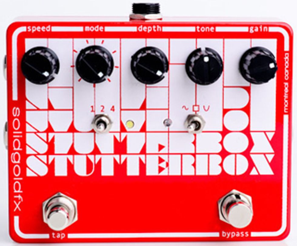 Montreal, Quebec (September 10, 2012) – SolidGoldFX is excited to announce the release of their new and improved Stutterbox optical tremolo pedal. The Stutterbox is a fresh design combining an all-analog tremolo relying on a light source and photocell to create it’s mesmerizing and throbbing effect reminiscent of our favorite vintage tube amps, with a powerful tap tempo controller. Multiple speed controls, various waveforms, inspired rhythmic modes and an adjustable output section make this a great sounding and versatile pedal.