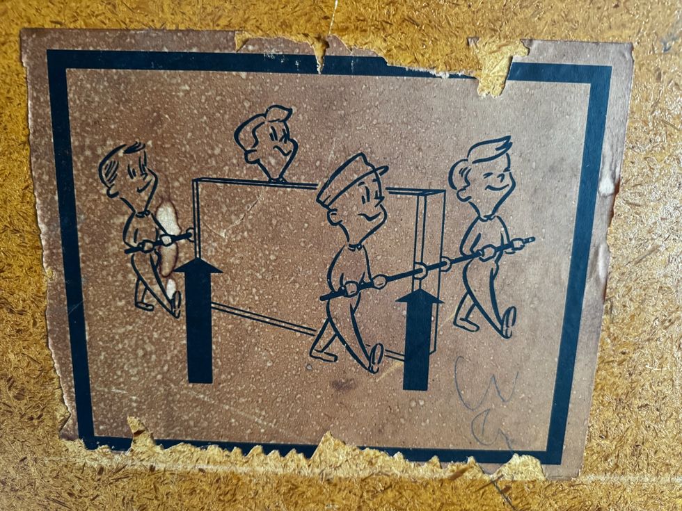 This sticker shows instructions from the German manufacturer on how to safely carry the massive 500-pound reverb housing.