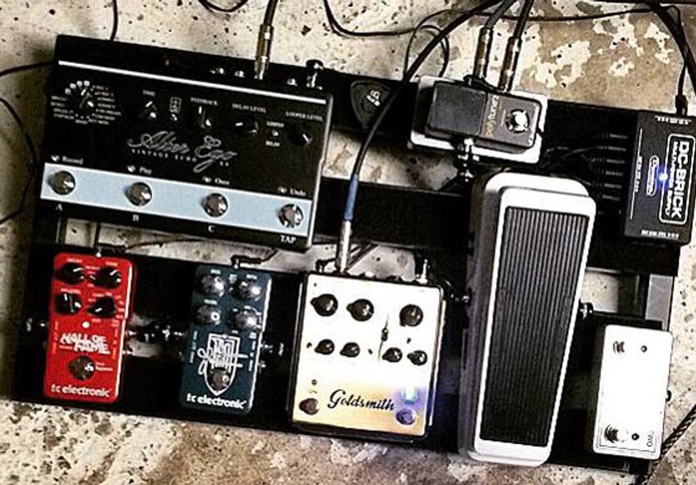 My board (see photo). But if I had to choose, it would be DJ Ashba’s. He has some great leads and killer wah going on! My current board: Pedals in front of amp (Engl E530 Preamp, footswitch on the side): TC Electronic PolyTune 2 Noir, Dunlop Cry Baby Bass Wah (Iove the low-end growl), Egnater Goldsmith. My effects loop (small junction box under tuner) has three TC Electronic boxes: Dreamscape, Hall Of Fame, Alter Ego X4.