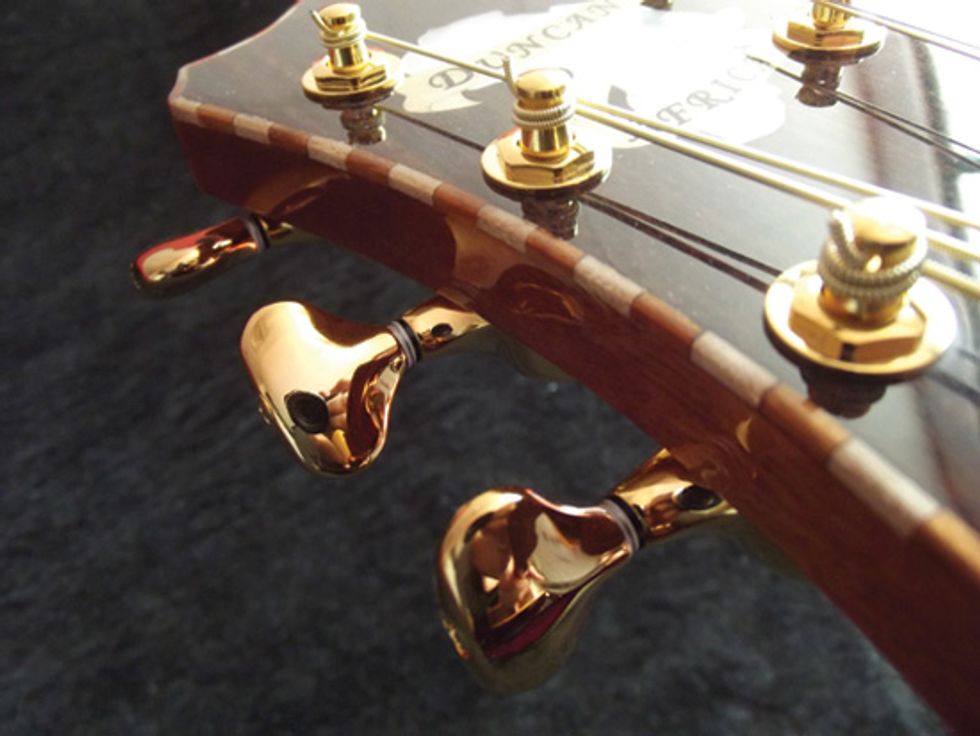 When asked what’s different about his 6-strings, Duncan prefaces the explanation with, “I am a tone freak," before going on to explain that many of the instruments’ tonal qualities are due to a unique “double-X” bracing system that he says allows the tone from the back and sides to really shine. East Indian rosewood gives a wide tonal range with strong highs and lows, while Western flamed maple lends a gorgeous aesthetic and a warmer tone that Duncan says is “almost vintage-sounding, right out of the box. We also use Ugandan mahogany and sapele, which makes for a nice, warm body with a bit of tinkle in the high mids, and the local mugavu has a powerful midrange.”