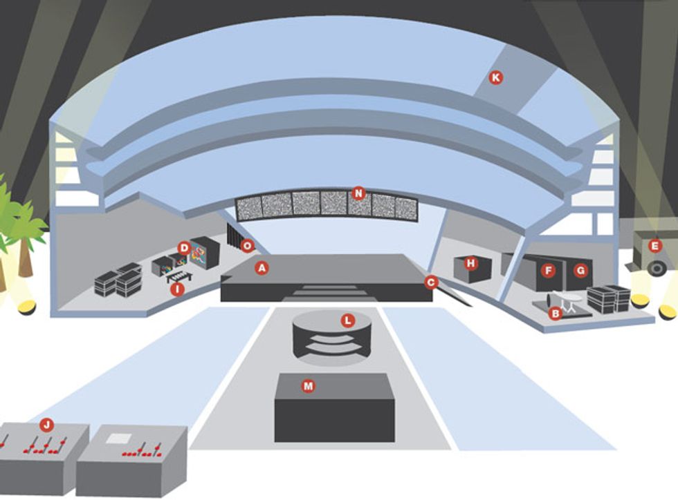 A. The Stage is wide enough to act as two stages (left and right) so that one side can be set up/ struck while the other hosts a live performance.