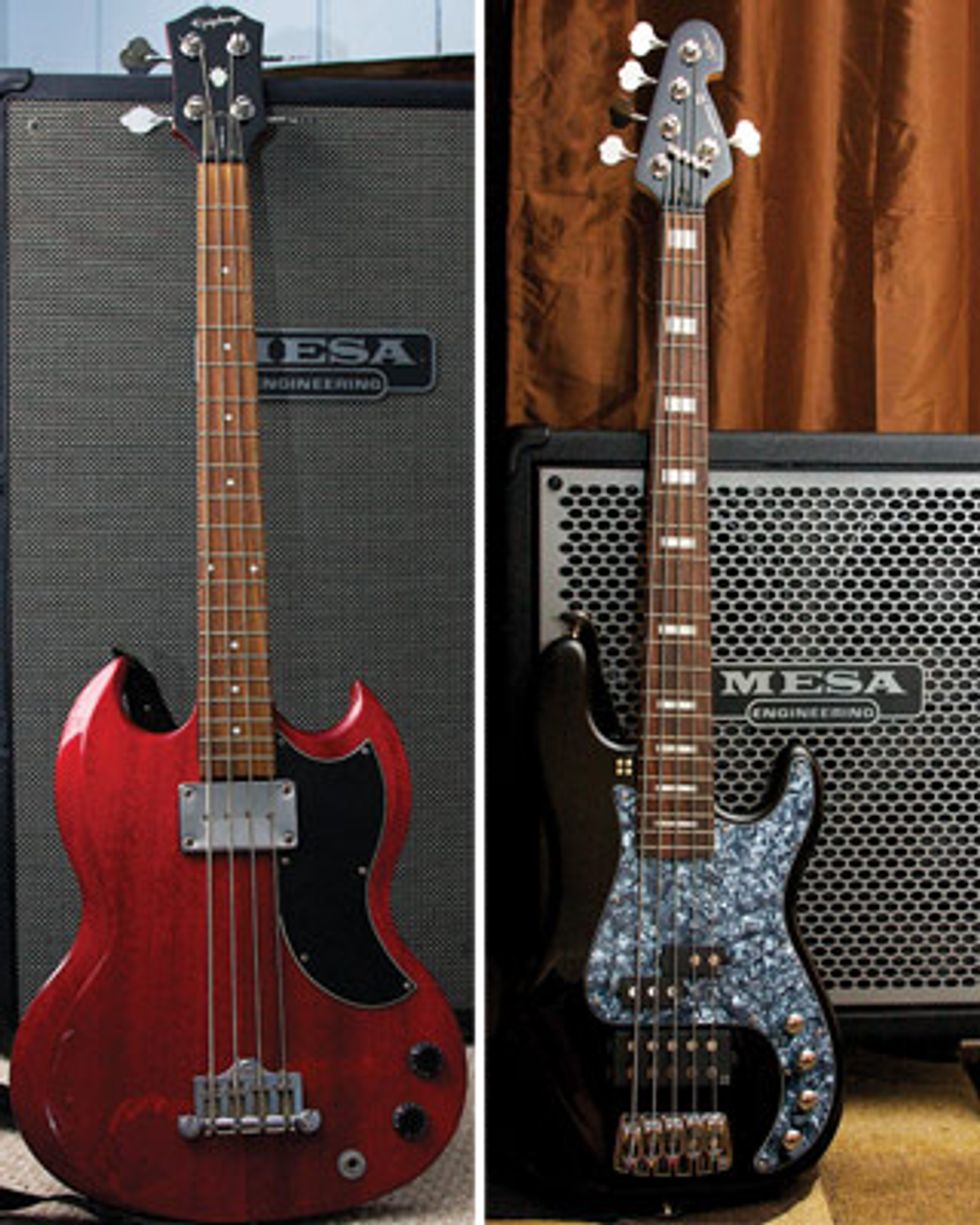 LEFT: If a gig calls for a large tone with a slower attack that focuses on the sub-low frequencies, the sound from the neck pickup on this short-scale Epiphone and a vintage 6x10 cab should do the trick.