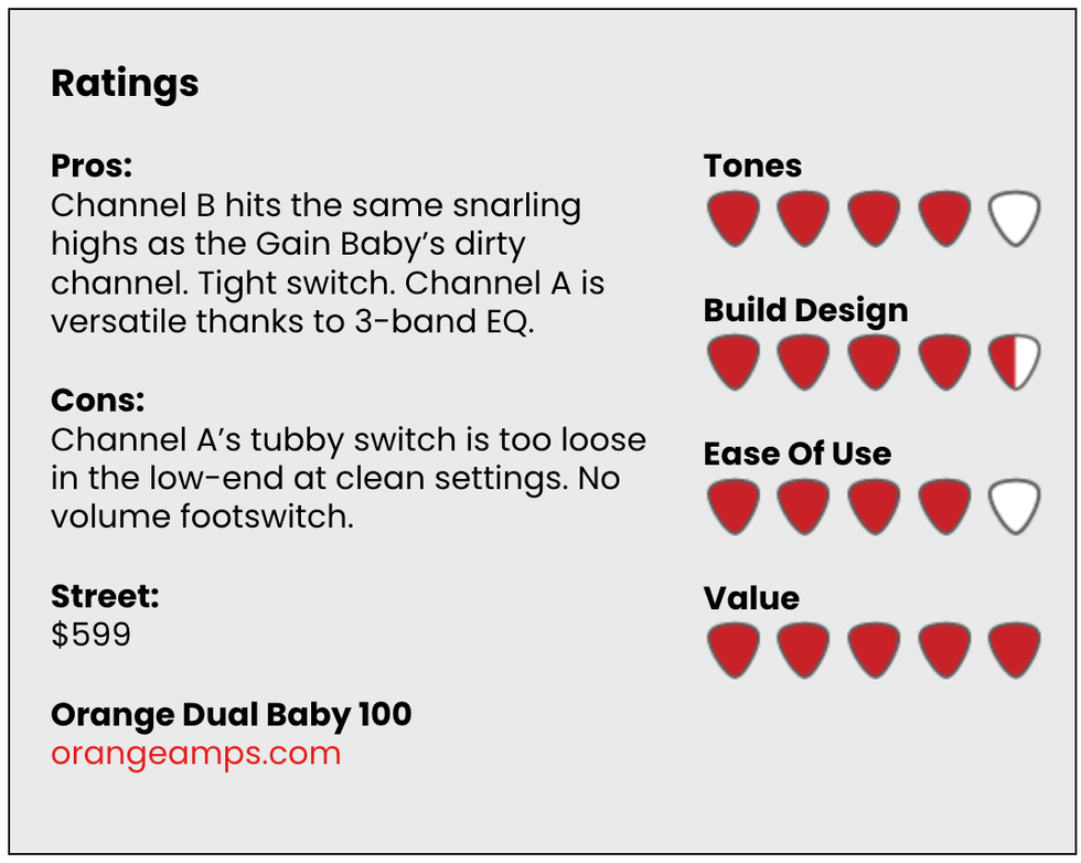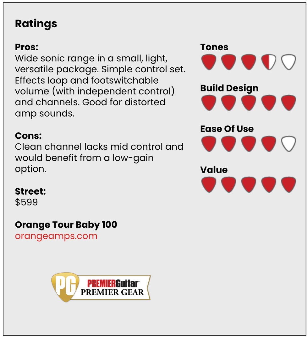 A 100-watt, 4-channel amplifier that can be mounted on a pedalboard? Meet the Amp 1, an ingenious device that combines a tube-powered preamp with a solid-state class-D power amp. Amp 1’s tones range from darn good to ridiculously good, and the 3-band EQ section works beautifully in all modes. Though not dramatic, the digital reverb is rich, musical, and convincingly spring-like. Amp 1 is a triumph of both engineering and sound design.