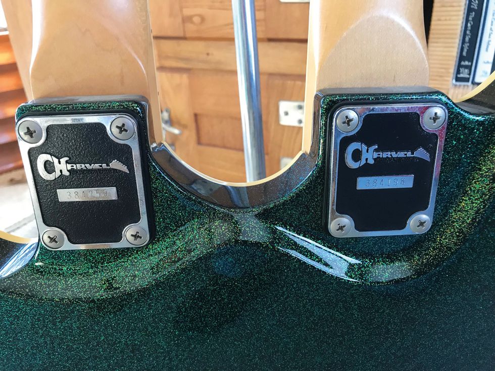 This is a rare bird on many levels. First of all, Charvel is generally known for their “pointy” guitars used by metalheads in the 1980s and 1990s, whereas this guitar’s ’50s-style body is a complete 180 from what Charvel typically produced. Second, it’s a doubleneck that very well could be one of just a handful made. And last, it has a green-pearloid finish that appears to be unique to just the Surfcaster doubleneck. Let’s talk some history.