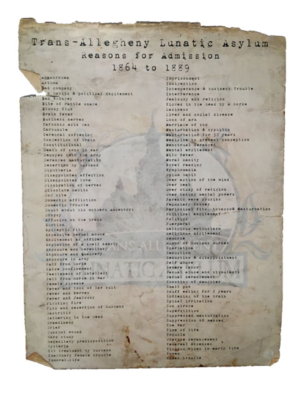 Among the head-scratcher reasons for dropping off someone you didn’t want around anymore were bullshit excuses like amenorrhea (absence of a menstrual cycle in an otherwise healthy woman), asthma, “bad company,” “bad habits & political excitement,” and “bad whiskey.” Only four lines in, and already you can smell the misogyny like so much raw sewage! See, a significant portion of TALA residents were perfectly sane wives and mothers unfortunate enough to be living at a time when women were essentially the property of their husbands or fathers. Wife serving ya shit booze and gettin’ uppity about all that suffrage nonsense? Ship ’er off to the loony bin—that’ll show ’er!